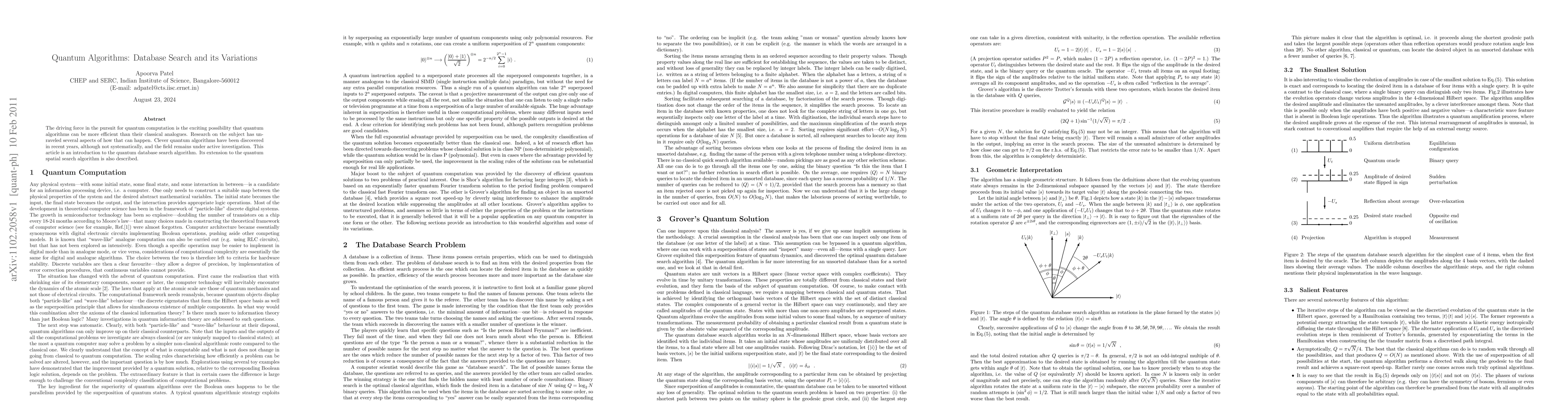 This paper introduces quantum algorithms for database search, highlighting their potential efficiency over classical methods, and extends the discussion to quantum spatial search algorithms. The field of quantum computation remains dynamic, with ongoing research uncovering new algorithmic possibilities.