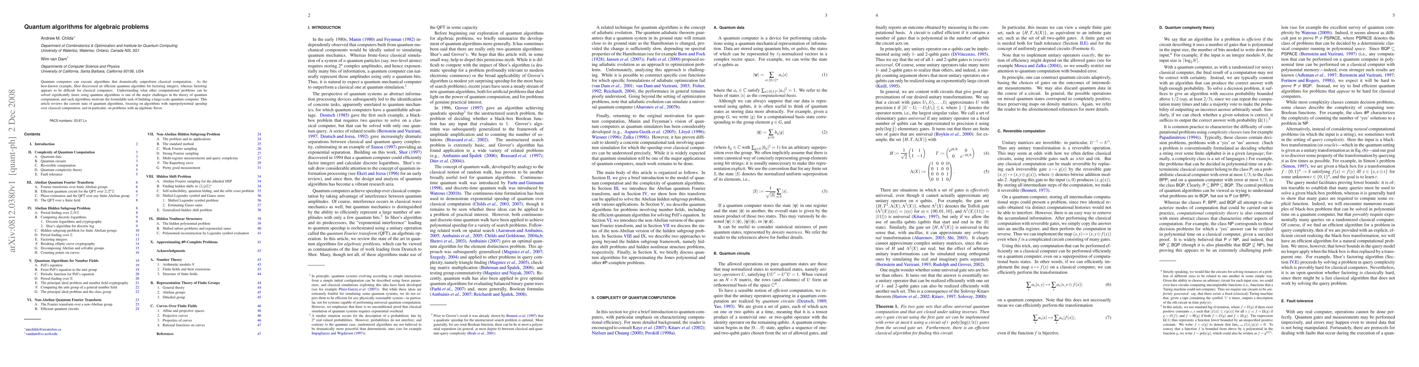 Quantum computers can execute algorithms that dramatically outperform classical computation. As the best-known example, Shor discovered an efficient quantum algorithm for factoring integers, whereas factoring appears to be difficult for classical computers. Understanding what other computational problems can be solved significantly faster using quantum algorithms is one of the major challenges in the theory of quantum computation, and such algorithms motivate the formidable task of building a large-scale quantum computer. This article reviews the current state of quantum algorithms, focusing on algorithms with superpolynomial speedup over classical computation, and in particular, on problems with an algebraic flavor.