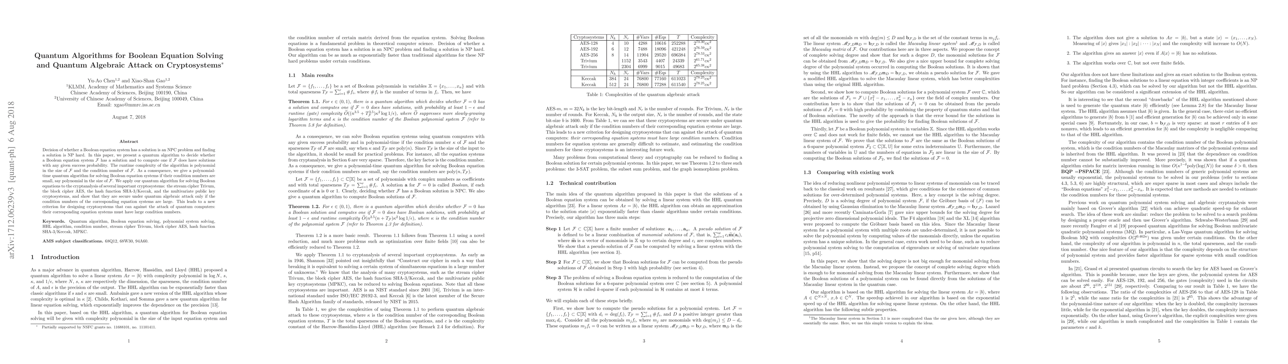This paper introduces a quantum algorithm for solving Boolean equation systems efficiently under certain conditions, providing a polynomial-time solution when the systems have small condition numbers. It also demonstrates the algorithm's application in cryptanalysis, showing that several cryptosystems are secure against quantum attacks if their underlying equation systems have large condition numbers.