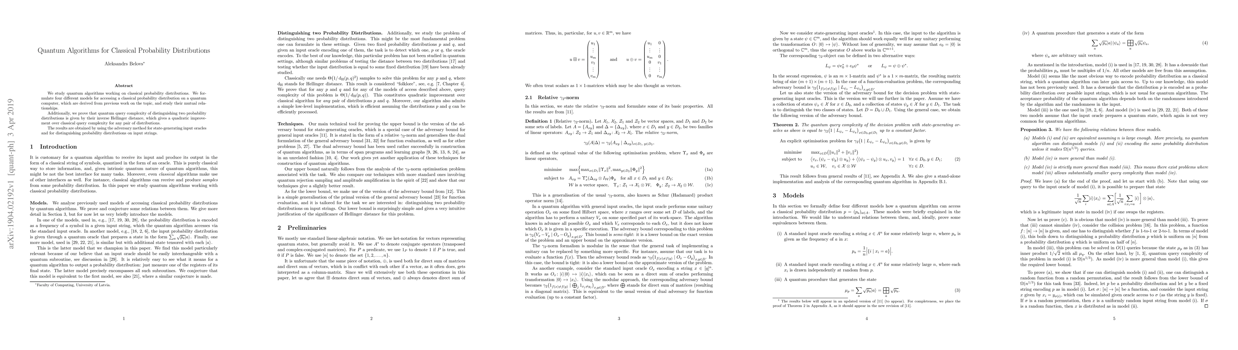 This paper investigates quantum algorithms for classical probability distributions, formulating four models for accessing them on a quantum computer and analyzing their relationships. It demonstrates a quadratic improvement over classical query complexity in distinguishing probability distributions using the inverse Hellinger distance.