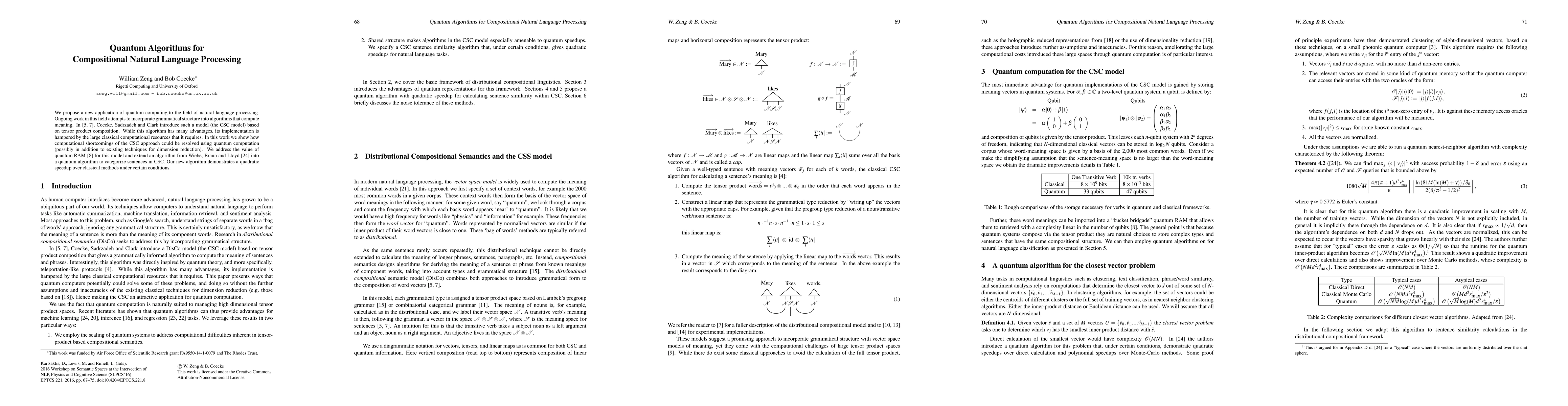 We propose a new application of quantum computing to the field of natural language processing. Ongoing work in this field attempts to incorporate grammatical structure into algorithms that compute meaning. In (Coecke, Sadrzadeh and Clark, 2010), the authors introduce such a model (the CSC model) based on tensor product composition. While this algorithm has many advantages, its implementation is hampered by the large classical computational resources that it requires. In this work we show how computational shortcomings of the CSC approach could be resolved using quantum computation (possibly in addition to existing techniques for dimension reduction). We address the value of quantum RAM (Giovannetti,2008) for this model and extend an algorithm from Wiebe, Braun and Lloyd (2012) into a quantum algorithm to categorize sentences in CSC. Our new algorithm demonstrates a quadratic speedup over classical methods under certain conditions.