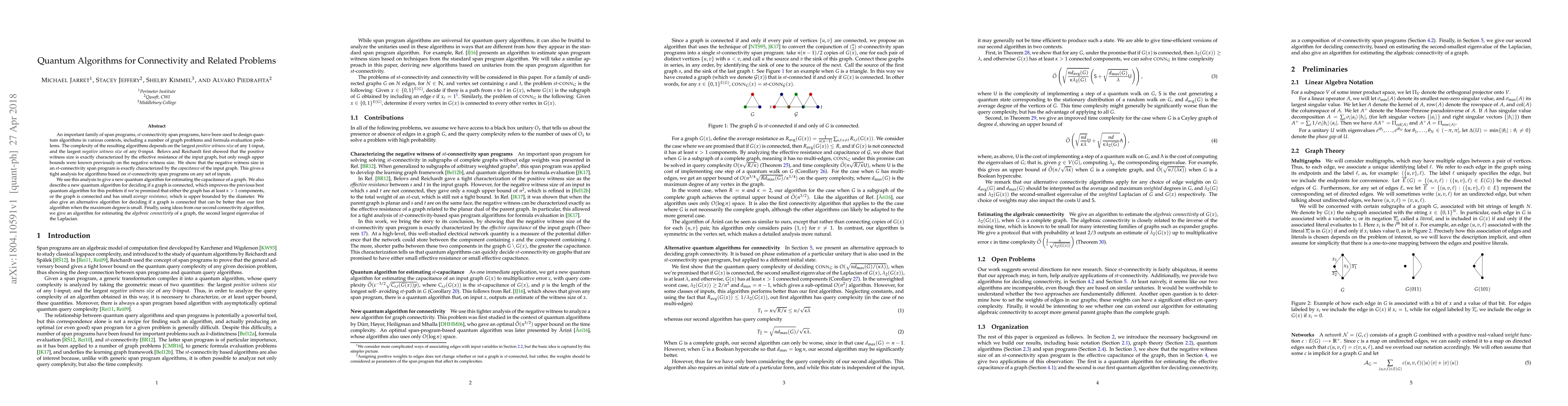 This paper develops new quantum algorithms for graph problems, including estimating capacitance, deciding connectivity, and calculating algebraic connectivity, with precise characterizations of witness sizes and improvements over existing methods.