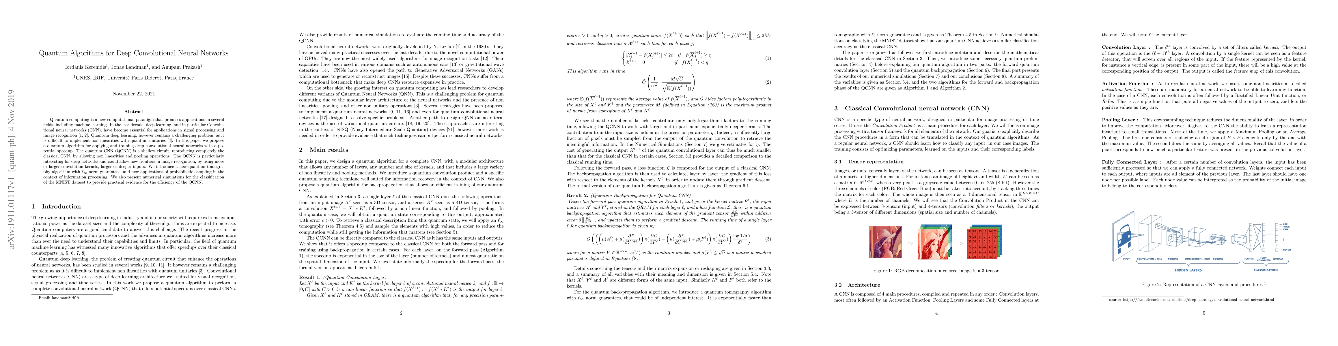 Quantum computing is a new computational paradigm that promises applications in several fields, including machine learning. In the last decade, deep learning, and in particular Convolutional neural networks (CNN), have become essential for applications in signal processing and image recognition. Quantum deep learning, however remains a challenging problem, as it is difficult to implement non linearities with quantum unitaries. In this paper we propose a quantum algorithm for applying and training deep convolutional neural networks with a potential speedup. The quantum CNN (QCNN) is a shallow circuit, reproducing completely the classical CNN, by allowing non linearities and pooling operations. The QCNN is particularly interesting for deep networks and could allow new frontiers in image recognition, by using more or larger convolution kernels, larger or deeper inputs. We introduce a new quantum tomography algorithm with $\ell_{\infty}$ norm guarantees, and new applications of probabilistic sampling in the context of information processing. We also present numerical simulations for the classification of the MNIST dataset to provide practical evidence for the efficiency of the QCNN.