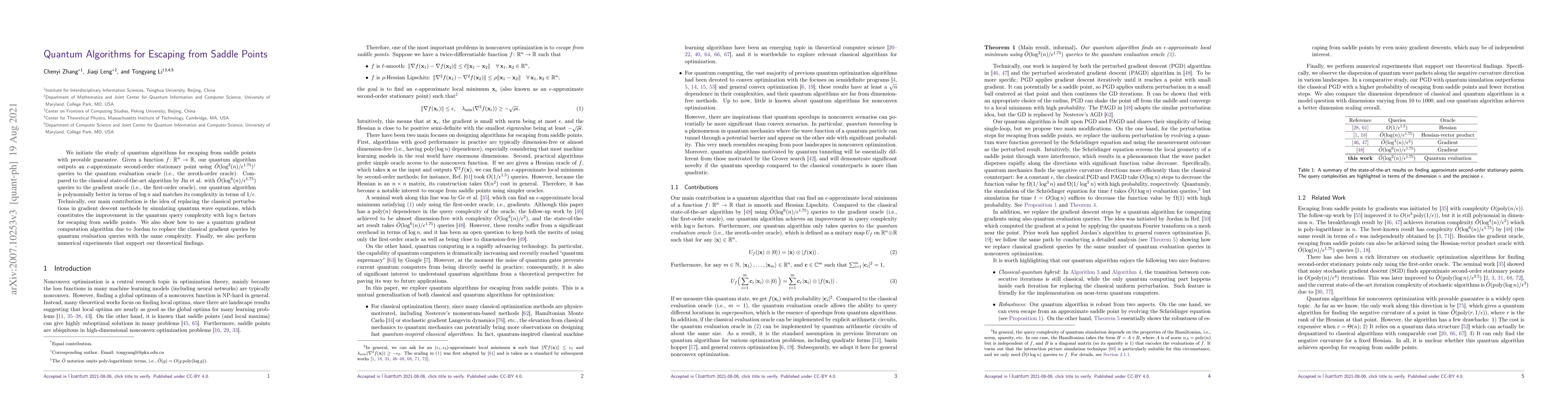 This paper introduces quantum algorithms for efficiently escaping saddle points in optimization, achieving polynomially fewer queries compared to classical methods. The quantum approach leverages quantum wave equations and gradient computations to improve query complexity significantly.