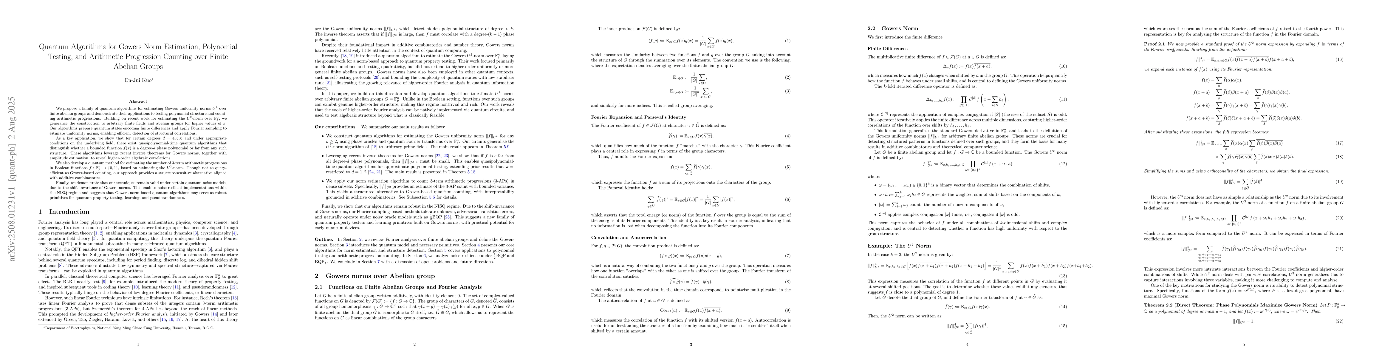 We propose a family of quantum algorithms for estimating Gowers uniformity norms $ U^k $ over finite abelian groups and demonstrate their applications to testing polynomial structure and counting arithmetic progressions. Building on recent work for estimating the $ U^2 $-norm over $ \mathbb{F}_2^n $, we generalize the construction to arbitrary finite fields and abelian groups for higher values of $ k $. Our algorithms prepare quantum states encoding finite differences and apply Fourier sampling to estimate uniformity norms, enabling efficient detection of structural correlations. As a key application, we show that for certain degrees $ d = 4, 5, 6 $ and under appropriate conditions on the underlying field, there exist quasipolynomial-time quantum algorithms that distinguish whether a bounded function $ f(x) $ is a degree-$ d $ phase polynomial or far from any such structure. These algorithms leverage recent inverse theorems for Gowers norms, together with amplitude estimation, to reveal higher-order algebraic correlations. We also develop a quantum method for estimating the number of 3-term arithmetic progressions in Boolean functions $ f : \mathbb{F}_p^n \to \{0,1\} $, based on estimating the $ U^2 $-norm. Though not as query-efficient as Grover-based counting, our approach provides a structure-sensitive alternative aligned with additive combinatorics. Finally, we demonstrate that our techniques remain valid under certain quantum noise models, due to the shift-invariance of Gowers norms. This enables noise-resilient implementations within the NISQ regime and suggests that Gowers-norm-based quantum algorithms may serve as robust primitives for quantum property testing, learning, and pseudorandomness.