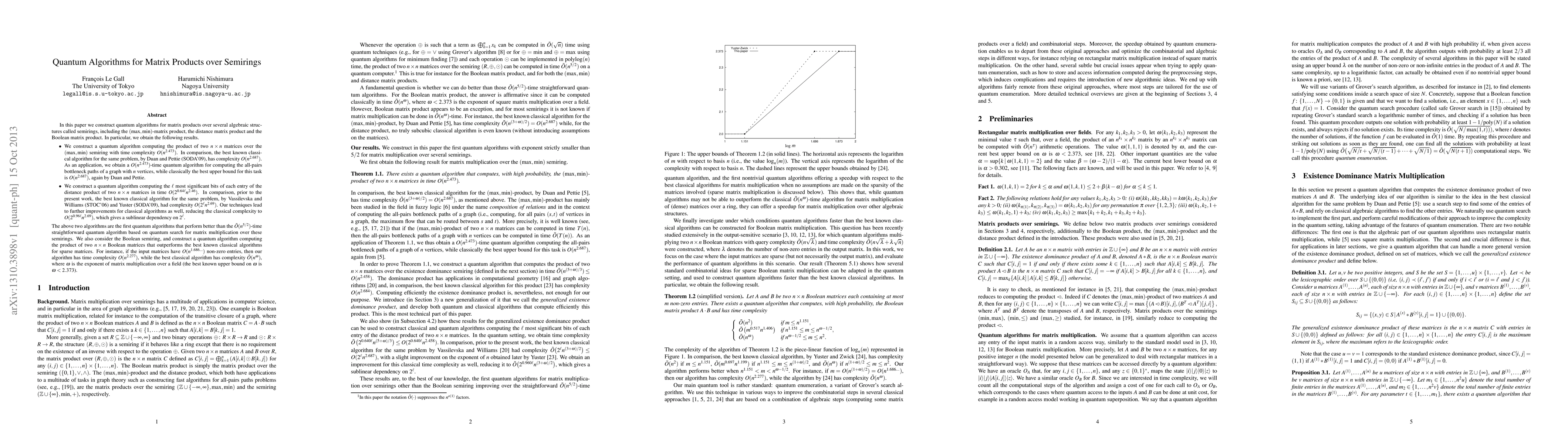 This paper presents quantum algorithms for matrix products over semirings, achieving significant improvements over classical algorithms. The quantum algorithm for (max,min)-matrix product reduces the time complexity to O(n^{2.473}), surpassing the classical O(n^{2.687}). It also introduces a quantum algorithm for computing the L most significant bits of distance matrix products with complexity O(2^{0.64L}n^{2.46}), outperforming the previous classical O(2^{L}n^{2.69}).