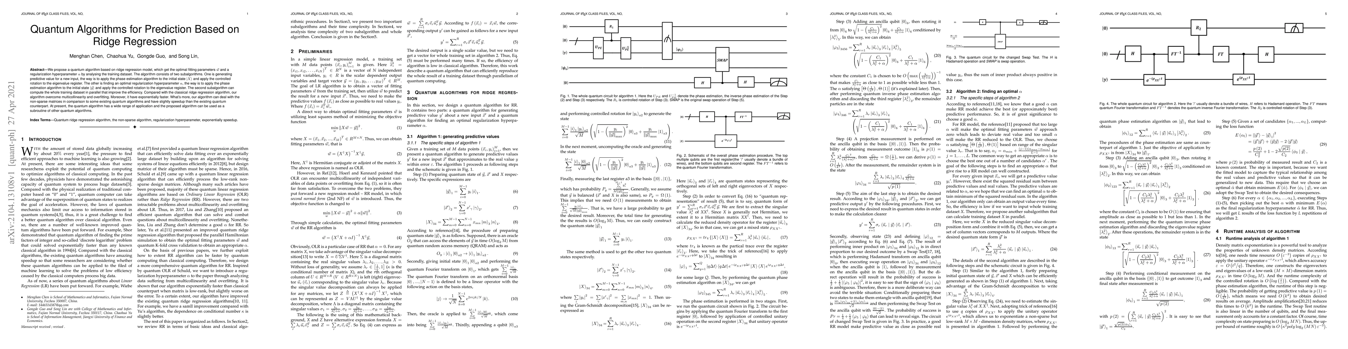We propose a quantum algorithm based on ridge regression model, which get the optimal fitting parameters w and a regularization hyperparameter {\alpha} by analysing the training dataset. The algorithm consists of two subalgorithms. One is generating predictive value for a new input, the way is to apply the phase estimation algorithm to the initial state |Xi and apply the controlled rotation to the eigenvalue register. The other is finding an optimal regularization hyperparameter {\alpha} , the way is to apply the phase estimation algorithm to the initial state |yi and apply the controlled rotation to the eigenvalue register. The second subalgorithm can compute the whole training dataset in parallel that improve the efficiency. Compared with the classical ridge regression algorithm, our algorithm overcome multicollinearity and overfitting. Moreover, it have exponentially faster. What's more, our algorithm can deal with the non-sparse matrices in comparison to some existing quantum algorithms and have slightly speedup than the existing quantum counterpart. At present, the quantum algorithm has a wide range of application and the proposed algorithm can be used as a subroutine of other quantum algorithms.