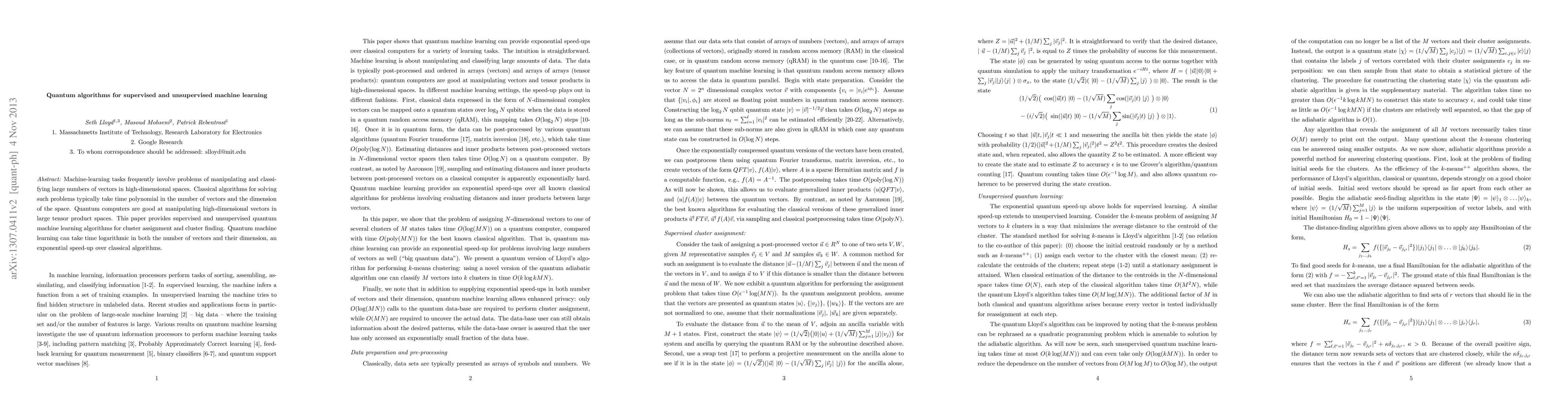 This paper introduces quantum algorithms for both supervised and unsupervised machine learning, demonstrating significant speed-ups by leveraging quantum computing's ability to manipulate high-dimensional vectors, achieving logarithmic time complexity compared to classical polynomial time methods.