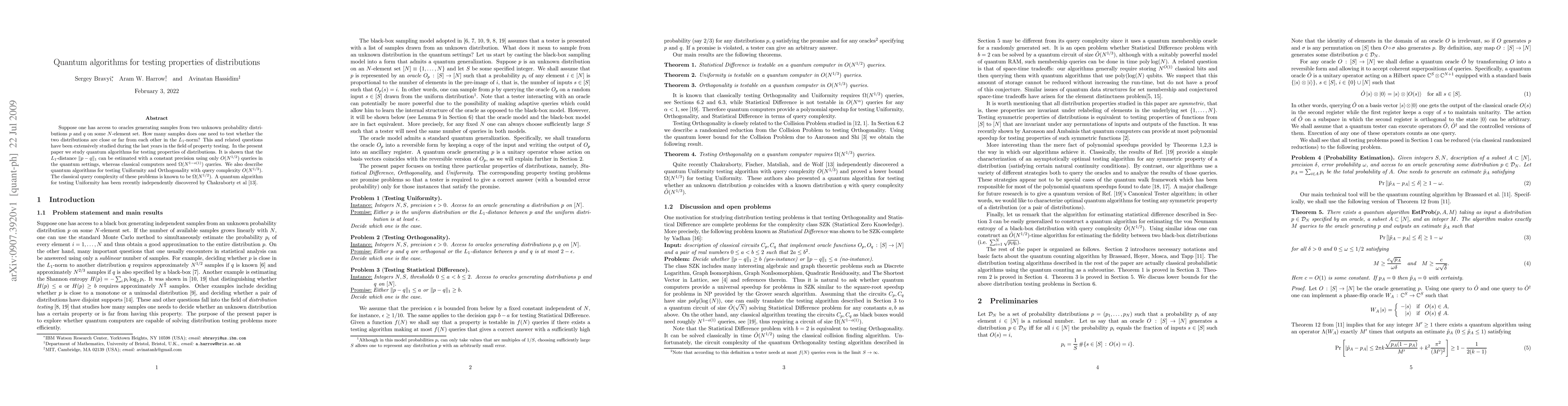 This paper investigates quantum algorithms for testing properties of probability distributions, demonstrating that the L_1-distance between two distributions can be estimated with a precision using approximately N^{1/2} queries, significantly fewer than the classical \Omega(N) queries. It also presents quantum algorithms for Uniformity and Orthogonality testing with query complexity O(N^{1/3}), outperforming the classical \Omega(N^{1/2}) complexity.