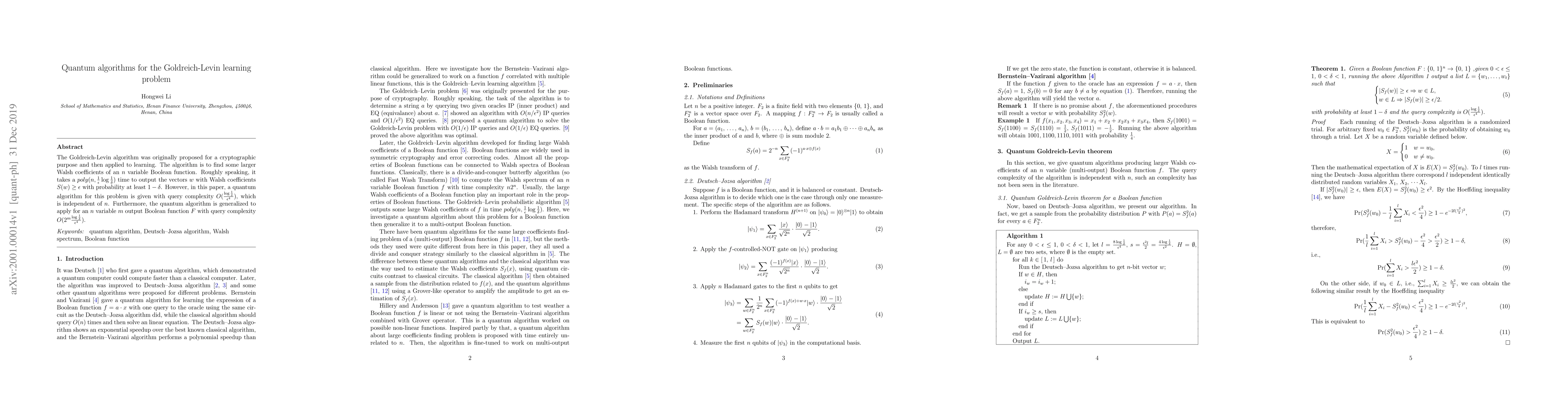 The Goldreich-Levin algorithm was originally proposed for a cryptographic purpose and then applied to learning. The algorithm is to find some larger Walsh coefficients of an $n$ variable Boolean function. Roughly speaking, it takes a $poly(n,\frac{1}{\epsilon}\log\frac{1}{\delta})$ time to output the vectors $w$ with Walsh coefficients $S(w)\geq\epsilon$ with probability at least $1-\delta$. However, in this paper, a quantum algorithm for this problem is given with query complexity $O(\frac{\log\frac{1}{\delta}}{\epsilon^4})$, which is independent of $n$. Furthermore, the quantum algorithm is generalized to apply for an $n$ variable $m$ output Boolean function $F$ with query complexity $O(2^m\frac{\log\frac{1}{\delta}}{\epsilon^4})$.