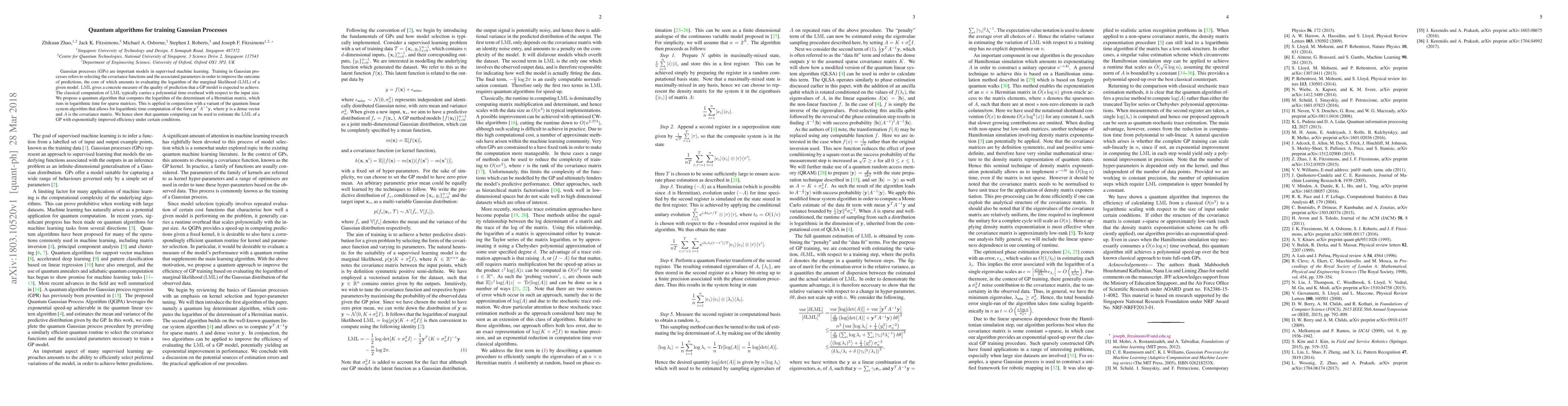 Gaussian processes (GPs) are important models in supervised machine learning. Training in Gaussian processes refers to selecting the covariance functions and the associated parameters in order to improve the outcome of predictions, the core of which amounts to evaluating the logarithm of the marginal likelihood (LML) of a given model. LML gives a concrete measure of the quality of prediction that a GP model is expected to achieve. The classical computation of LML typically carries a polynomial time overhead with respect to the input size. We propose a quantum algorithm that computes the logarithm of the determinant of a Hermitian matrix, which runs in logarithmic time for sparse matrices. This is applied in conjunction with a variant of the quantum linear system algorithm that allows for logarithmic time computation of the form $\mathbf{y}^TA^{-1}\mathbf{y}$, where $\mathbf{y}$ is a dense vector and $A$ is the covariance matrix. We hence show that quantum computing can be used to estimate the LML of a GP with exponentially improved efficiency under certain conditions.