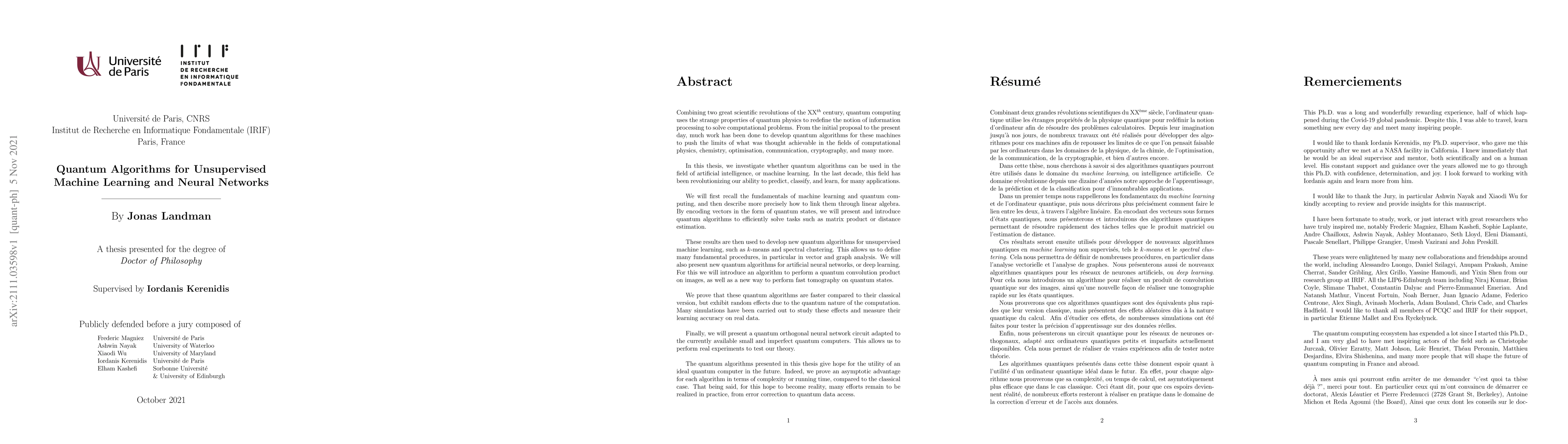 This paper explores quantum algorithms for unsupervised machine learning and neural networks, demonstrating how quantum computing can efficiently solve tasks like matrix products and distance estimation. It introduces quantum versions of k-means and spectral clustering, and proposes a quantum convolution algorithm for image processing, showing faster performance compared to classical methods, albeit with quantum-induced randomness.