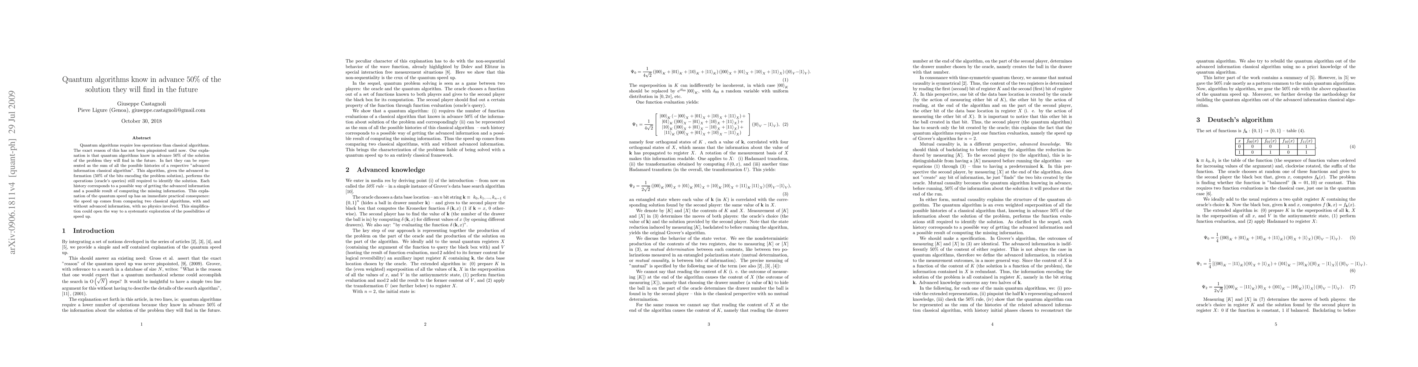 This research proposes that quantum algorithms leverage 'advanced information', knowing 50% of the solution in advance, which can be visualized as a sum of all possible histories of a classical algorithm with such information. This insight simplifies understanding quantum speed-up, suggesting it could be explored systematically by comparing classical algorithms with and without this advanced knowledge, without needing to delve into quantum physics.