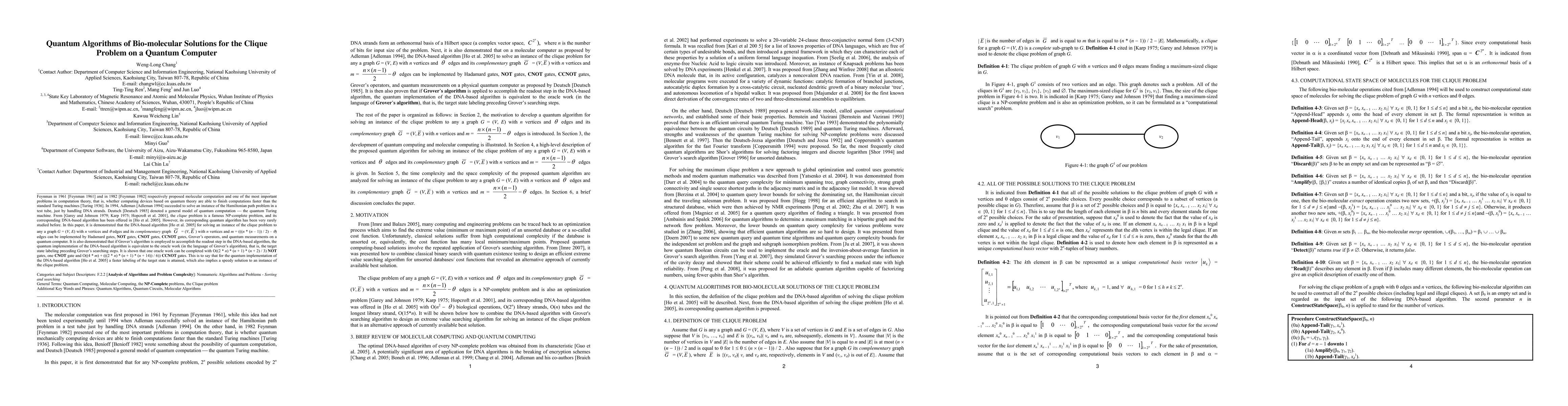 This paper demonstrates the implementation of a DNA-based algorithm for solving the clique problem on a quantum computer using quantum gates and Grover's algorithm. It shows that the quantum implementation achieves faster target state labeling and thus a quicker solution to the problem.