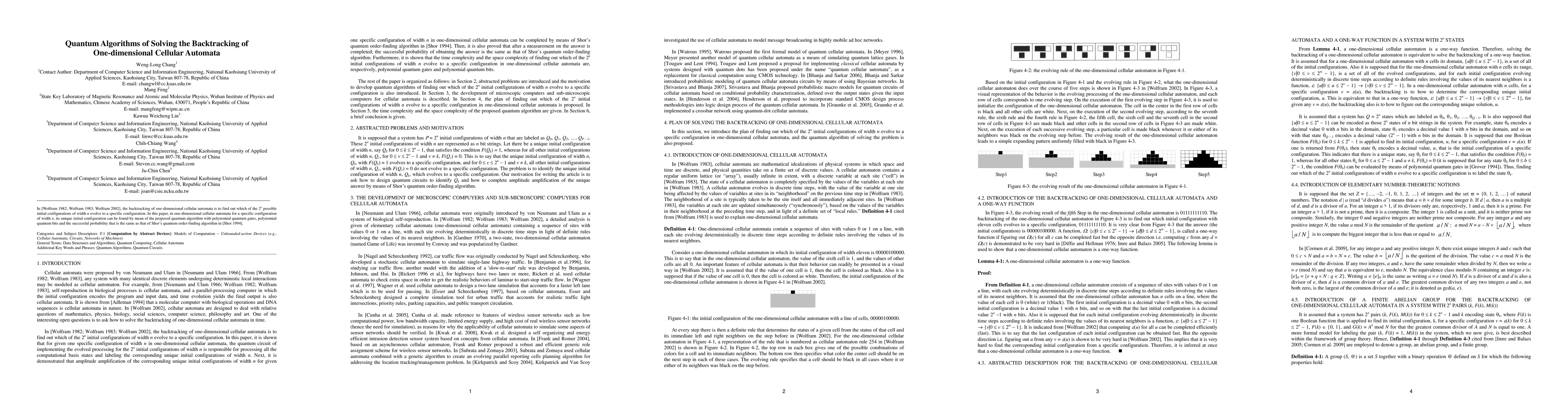 In [Wolfram 1982; Wolfram 1983; Wolfram 2002], the backtracking of one-dimensional cellular automata is to find out which of the 2n possible initial configurations of width n evolve to a specific configuration. In this paper, in one-dimensional cellular automata for a specific configuration of width n, its unique initial configuration can be found by mean of the proposed quantum algorithm with polynomial quantum gates, polynomial quantum bits and the successful probability that is the same as that of Shor's quantum order-finding algorithm in [Shor 1994].