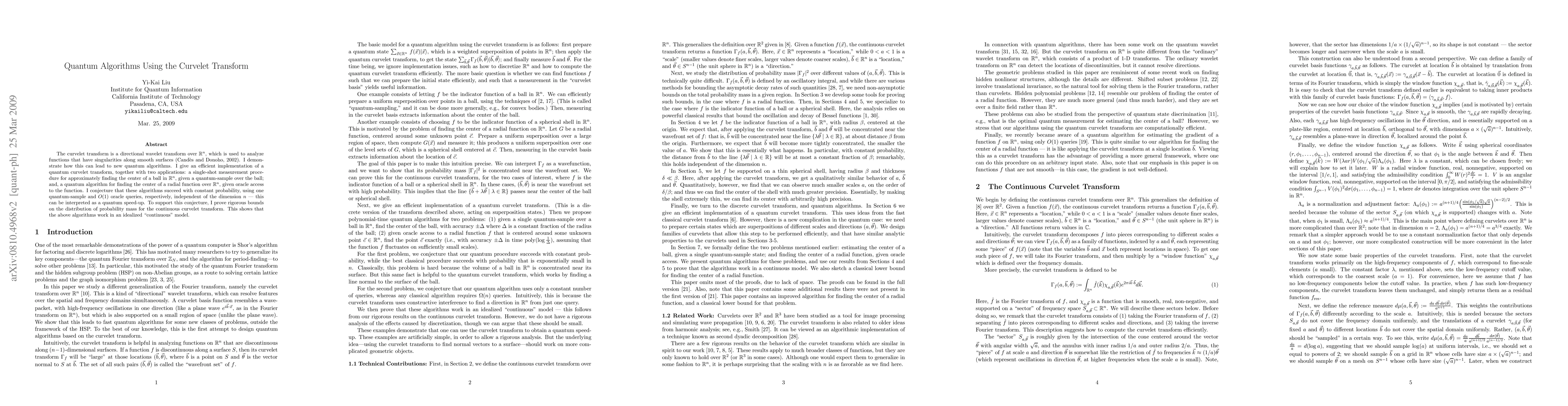 The curvelet transform is a directional wavelet transform over R^n, which is used to analyze functions that have singularities along smooth surfaces (Candes and Donoho, 2002). I demonstrate how this can lead to new quantum algorithms. I give an efficient implementation of a quantum curvelet transform, together with two applications: a single-shot measurement procedure for approximately finding the center of a ball in R^n, given a quantum-sample over the ball; and, a quantum algorithm for finding the center of a radial function over R^n, given oracle access to the function. I conjecture that these algorithms succeed with constant probability, using one quantum-sample and O(1) oracle queries, respectively, independent of the dimension n -- this can be interpreted as a quantum speed-up. To support this conjecture, I prove rigorous bounds on the distribution of probability mass for the continuous curvelet transform. This shows that the above algorithms work in an idealized "continuous" model.