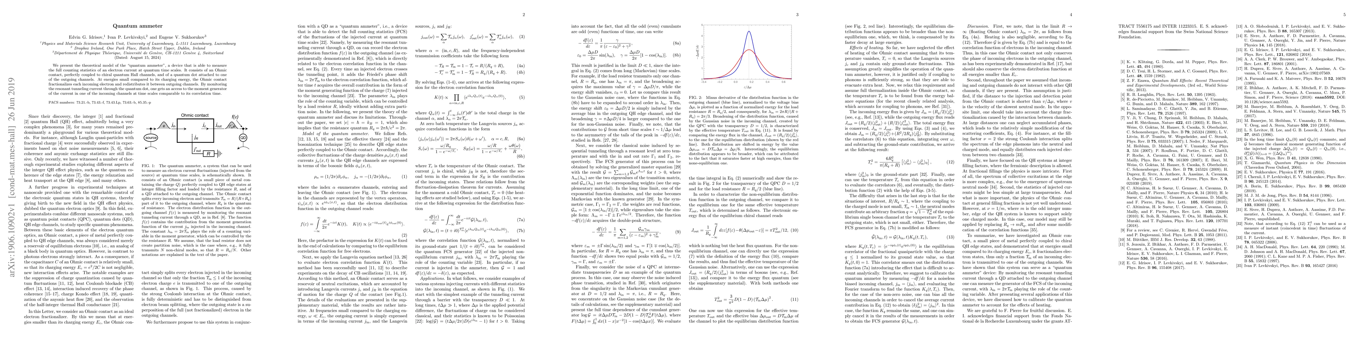 We present the theoretical model of the "quantum ammeter", a device that is able to measure the full counting statistics of an electron current at quantum time scales. It consists of an Ohmic contact, perfectly coupled to chiral quantum Hall channels, and of a quantum dot attached to one of the outgoing channels. At energies small compared to its charging energy, the Ohmic contact fractionalizes each incoming electron and redistributes it between outgoing channels. By monitoring the resonant tunneling current through the quantum dot, one gets an access to the moment generator of the current in one of the incoming channels at time scales comparable to its correlation time.