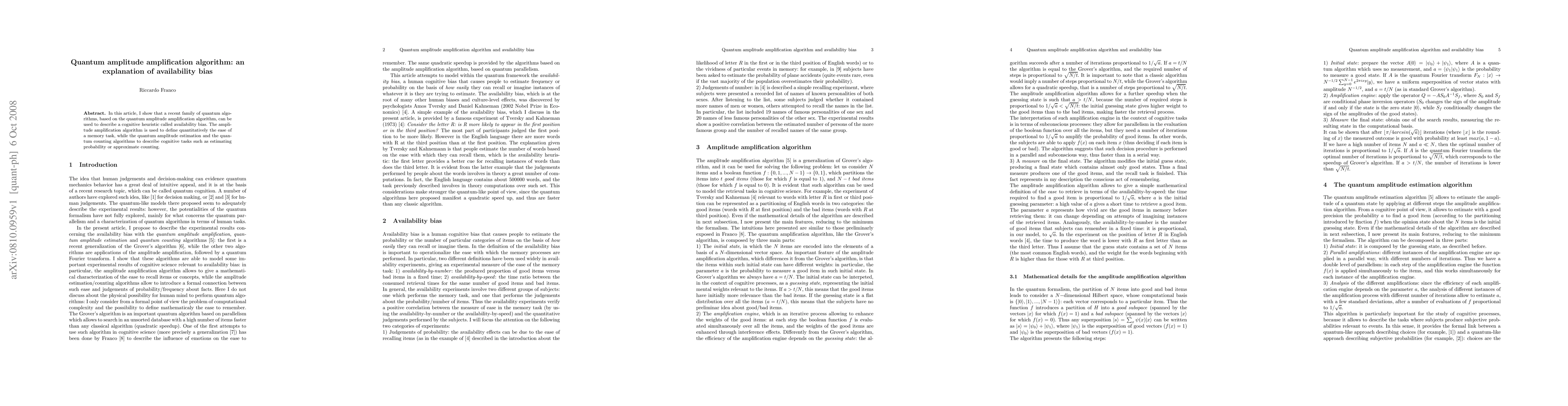 In this article, I show that a recent family of quantum algorithms, based on the quantum amplitude amplification algorithm, can be used to describe a cognitive heuristic called availability bias. The amplitude amplification algorithm is used to define quantitatively the ease of a memory task, while the quantum amplitude estimation and the quantum counting algorithms to describe cognitive tasks such as estimating probability or approximate counting.