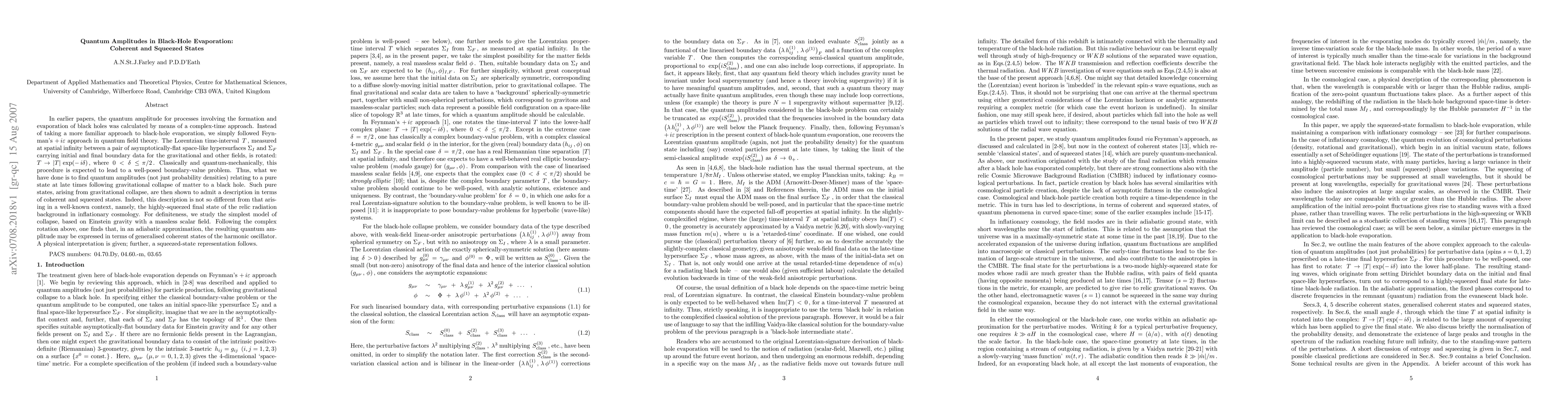 The quantum amplitude for processes involving the formation and evaporation of black holes was previously calculated by means of a complex-time approach. In that treatment, we followed Feynman's $+i\epsilon$ approach in quantum field theory. The Lorentzian time interval $T$, measured at spatial infinity between a pair of asymptotically flat spacelike hypersurfaces $\Sigma_I$ and $\Sigma_F$ carrying initial and final boundary data for the gravitational and other fields, is rotated: $T\to{\mid}T{\mid}\exp(-i\delta)$, where $0< \delta \leq{\pi}/2$. Classically and quantum mechanically, this procedure is expected to lead to a well-posed boundary-value problem. Thus, we have found quantum amplitudes (not just probability densities) relating to a pure state at late times following gravitational collapse of matter to a black hole. Such pure states, arising from gravitational collapse, admit a description in terms of coherent and squeezed states. Indeed, this description is not so different from that arising in a well-known context, namely, the highly-squeezed final state of the relic radiation background in inflationary cosmology. For definiteness, we study the simplest model of collapse, based on Einstein gravity with a massless scalar field. Following the complex rotation above, one finds that, in an adiabatic approximation, the resulting quantum amplitude may be expressed in terms of generalized coherent states of the harmonic oscillator. A physical interpretation is given; further, a squeezed-state representation follows.