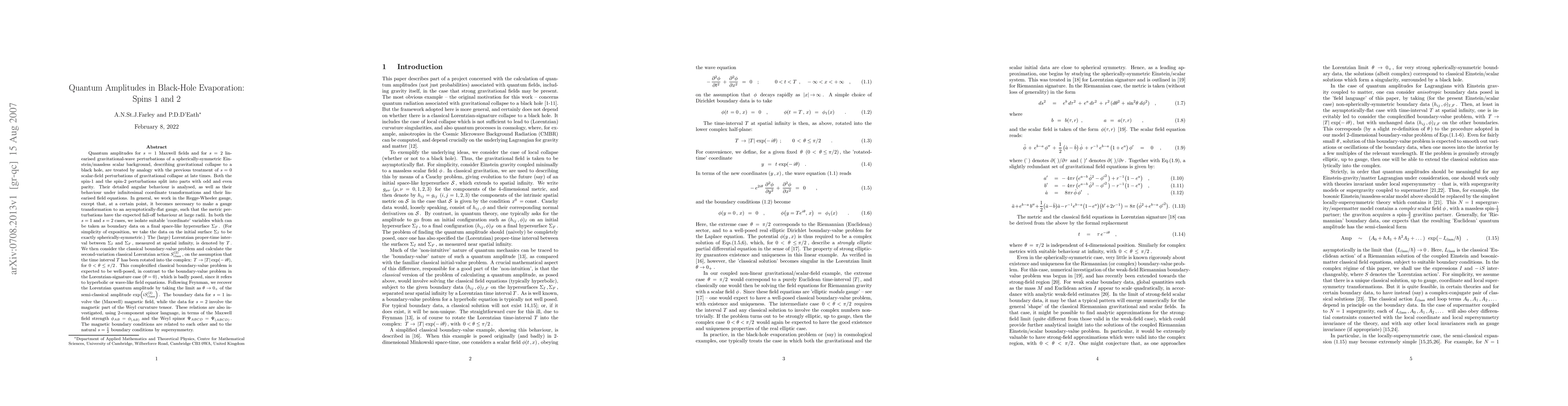 Quantum amplitudes for $s=1$ at Maxwell fields and for $s=2$ linearised gravitational wave perturbations of a spherically symmetric Einstein/massless scalar background, describing gravitational collapse to a black hole, are treated by analogy with a previous treatment of $s=0$ scalar-field perturbations of gravitational collapse at late times. In both the $s=1$ and $s=2$ cases, we isolate suitable 'co-ordinate' variables which can be taken as boundary data on a final space-like hypersurface $\Sigma_F$. For simplicity, we take the data on an initial pre-collapse surface $\Sigma_I$ to be exactly spherically symmetric. The (large) Lorentzian proper-time interval between $\Sigma_{I}, \Sigma_{F}$, measured at spatial infinity, is denoted by $T$. The complexified classical boundary-value problem is expected to be well-posed, provide that the time interval $T$ has been rotated into the complex: $T\to{\mid}T{\mid}\exp(-i\theta)$, for $0<\theta\leq{\pi}/2$. We calculate the second-variation classical Lorenztian action $S ^{(2)}_{\rm class}$. Following Feynman, we recover the Lorentzian quantum amplitude by taking the limit as $\theta\to 0_+$ of the semi-classical amplitude $\exp(iS^{(2)}_{\rm class})$. The boundary data for $ s=1$ involve the Maxwell magnetic field; the data for $s=2$ involve the magnetic part of the Weyl curvature tensor. The magnetic boundary conditions are related to each other and to the natural $s={1 \over 2}$ boundary conditions by supersymmetry.