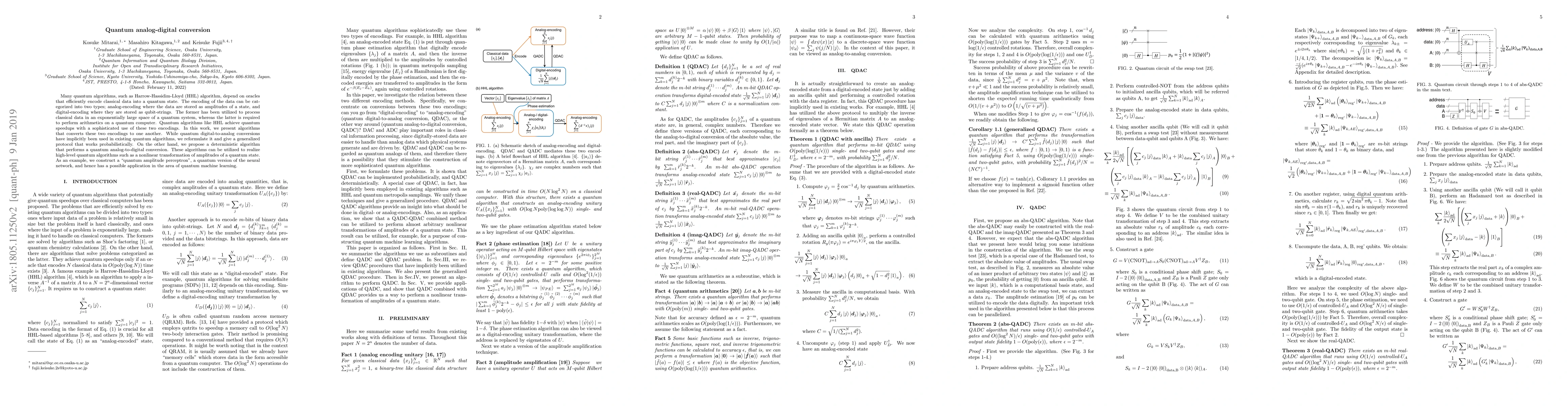 Many quantum algorithms, such as Harrow-Hassidim-Lloyd (HHL) algorithm, depend on oracles that efficiently encode classical data into a quantum state. The encoding of the data can be categorized into two types; analog-encoding where the data are stored as amplitudes of a state, and digital-encoding where they are stored as qubit-strings. The former has been utilized to process classical data in an exponentially large space of a quantum system, where as the latter is required to perform arithmetics on a quantum computer. Quantum algorithms like HHL achieve quantum speedups with a sophisticated use of these two encodings. In this work, we present algorithms that converts these two encodings to one another. While quantum digital-to-analog conversions have implicitly been used in existing quantum algorithms, we reformulate it and give a generalized protocol that works probabilistically. On the other hand, we propose an deterministic algorithm that performs a quantum analog-to-digital conversion. These algorithms can be utilized to realize high-level quantum algorithms such as a nonlinear transformation of amplitude of a quantum state. As an example, we construct a "quantum amplitude perceptron", a quantum version of neural network, and hence has a possible application in the area of quantum machine learning.
