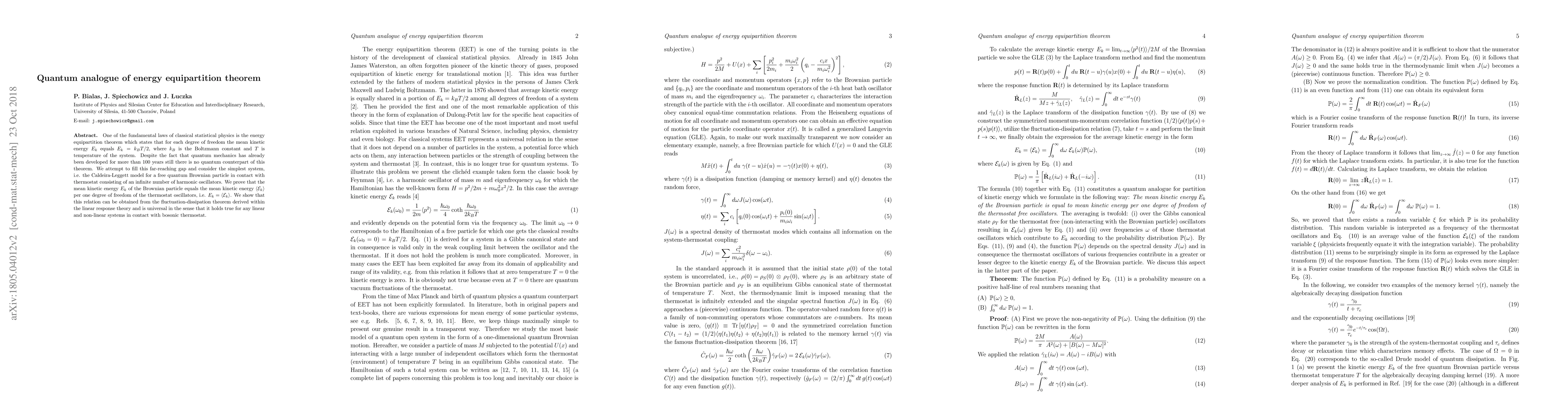 One of the fundamental laws of classical statistical physics is the energy equipartition theorem which states that for each degree of freedom the mean kinetic energy $E_k$ equals $E_k=k_B T/2$, where $k_B$ is the Boltzmann constant and $T$ is temperature of the system. Despite the fact that quantum mechanics has already been developed for more than 100 years still there is no quantum counterpart of this theorem. We attempt to fill this far-reaching gap and consider the simplest system, i.e. the Caldeira-Leggett model for a free quantum Brownian particle in contact with thermostat consisting of an infinite number of harmonic oscillators. We prove that the mean kinetic energy $E_k$ of the Brownian particle equals the mean kinetic energy $\langle \mathcal E_k \rangle$ per one degree of freedom of the thermostat oscillators, i.e. $E_k = \langle \mathcal E_k \rangle$. We show that this relation can be obtained from the fluctuation-dissipation theorem derived within the linear response theory and is universal in the sense that it holds true for any linear and non-linear systems in contact with bosonic thermostat.