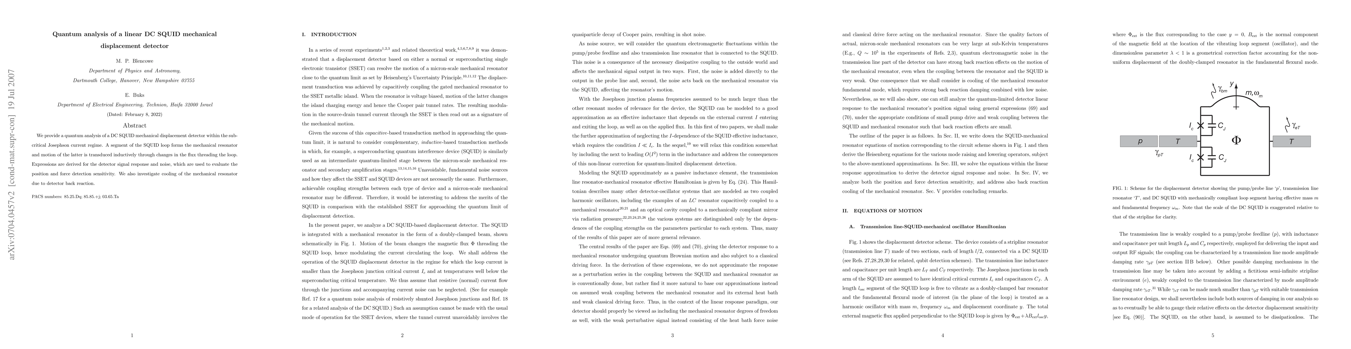 This paper presents a quantum analysis of a DC SQUID mechanical displacement detector operating in the sub-critical Josephson current regime, deriving expressions for signal response and noise, and evaluates its sensitivity for position and force detection, while also considering the cooling effect of back reaction noise.