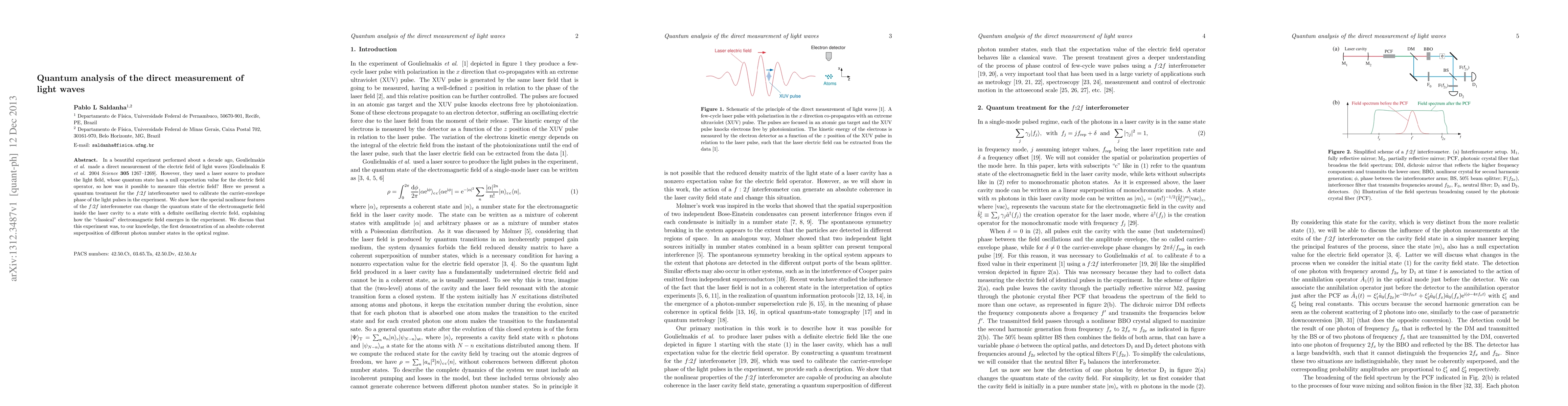 In a beautiful experiment performed about a decade ago, Goulielmakis et al. made a direct measurement of the electric field of light waves [E. Goulielmakis et al., Science 305, 1267-1269 (2004)]. However, they used a laser source to produce the light field, whose quantum state has a null expectation value for the electric field operator, so how was it possible to measure this electric field? Here we present a quantum treatment for the f:2f interferometer used to calibrate the carrier-envelope phase of the light pulses in the experiment. We show how the special nonlinear features of the f:2f interferometer can change the quantum state of the electromagnetic field inside the laser cavity to a state with a definite oscillating electric field, explaining how the "classical" electromagnetic field emerges in the experiment. We discuss that this experiment was, to our knowledge, the first demonstration of an absolute coherent superposition of different photon number states in the optical regime.