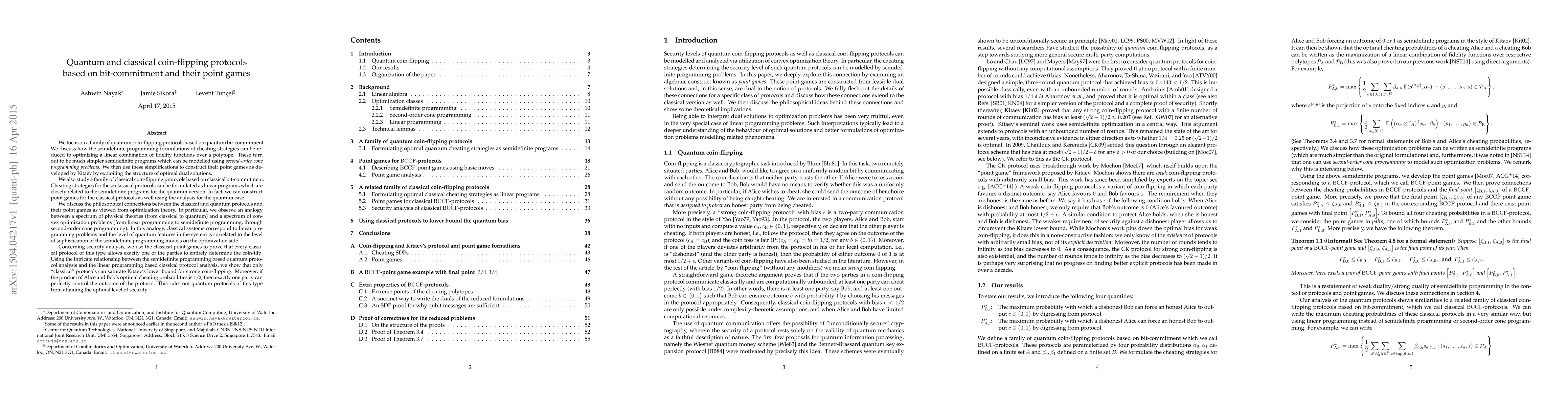 This paper explores quantum and classical coin-flipping protocols based on bit-commitment, formulating cheating strategies using semidefinite programming and constructing point games. It reveals an analogy between classical and quantum systems and optimization problems, showing that classical protocols can achieve optimal security while quantum protocols cannot.