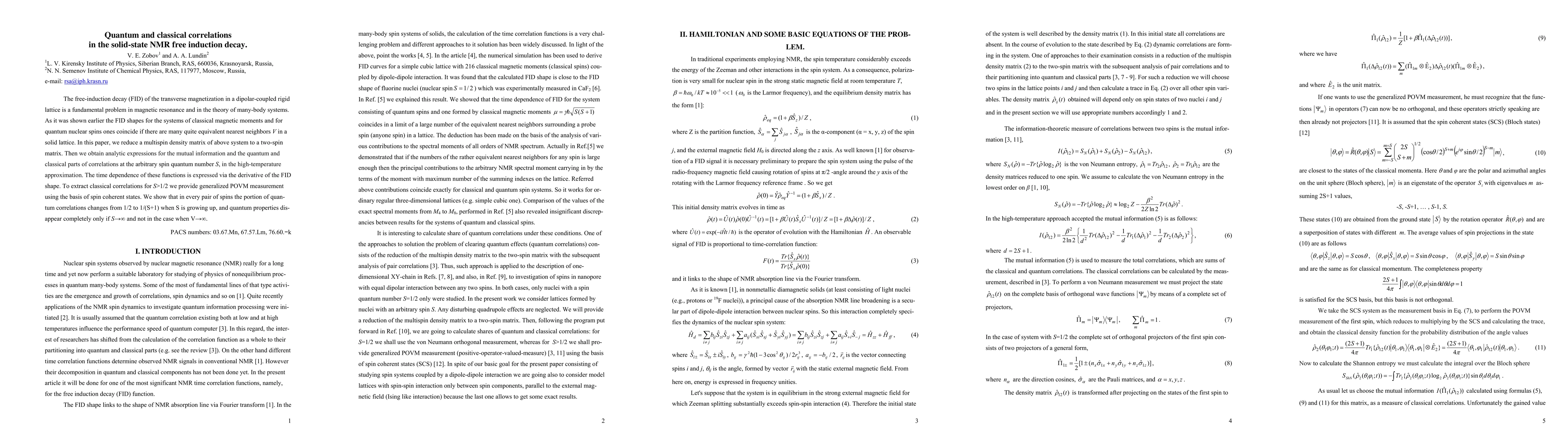 This paper investigates the free-induction decay (FID) in solid-state NMR, deriving analytic expressions for mutual information and quantum/classical correlations for systems with spin quantum number S. The study reveals that quantum correlations diminish as S increases, vanishing only as S approaches infinity.