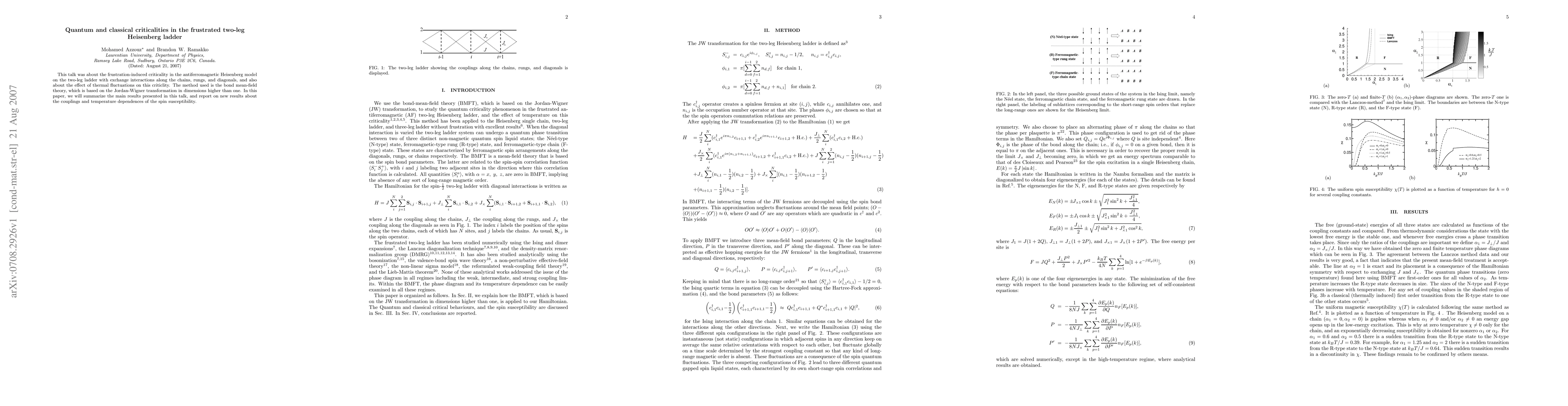 This talk was about the frustration-induced criticality in the antiferromagnetic Heisenberg model on the two-leg ladder with exchange interactions along the chains, rungs, and diagonals, and also about the effect of thermal fluctuations on this criticlity. The method used is the bond mean-field theory, which is based on the Jordan-Wigner transformation in dimensions higher than one. In this paper, we will summarize the main results presented in this talk, and report on new results about the couplings and temperature dependences of the spin susceptibility.