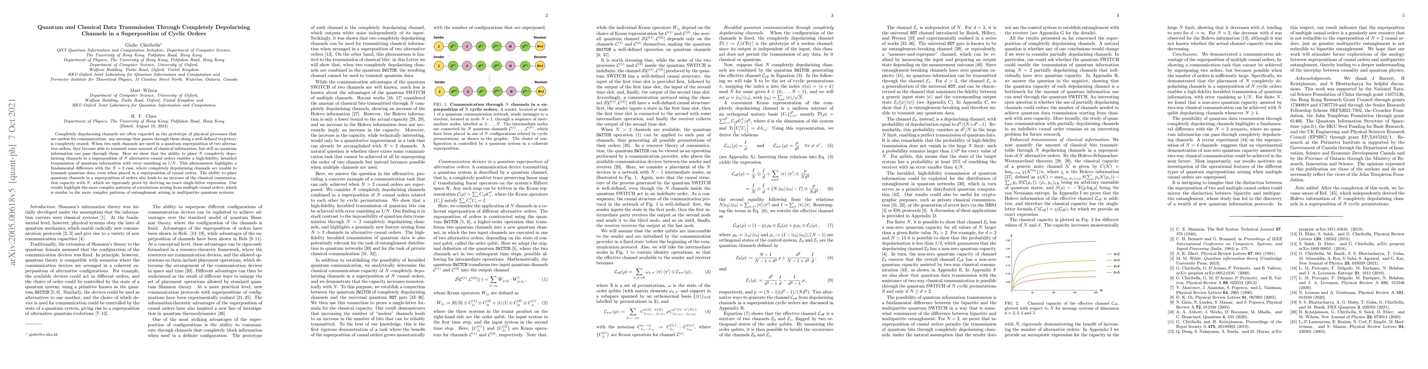 This paper demonstrates that placing N completely depolarising channels in a superposition of N causal orders allows for high-fidelity transmission of quantum information, with error diminishing as 1/N. It also shows an increase in classical communication capacity with N, highlighting complex patterns of correlations akin to multipartite entanglement.