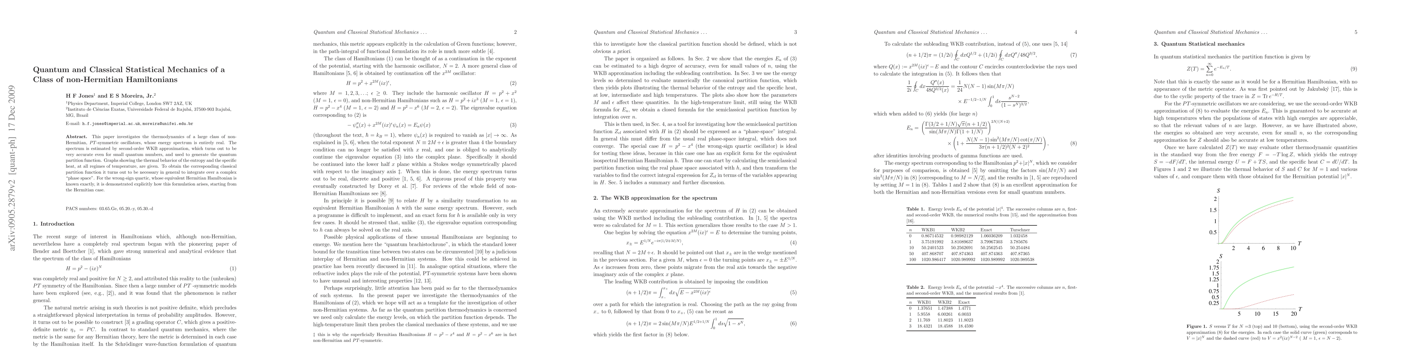 This paper investigates non-Hermitian Hamiltonians for their thermodynamics, finding that their energy spectrum is entirely real and using second-order WKB approximation to calculate the quantum partition function. The results show thermal behavior of entropy and specific heat at all regimes of temperature, with implications for understanding complex systems.