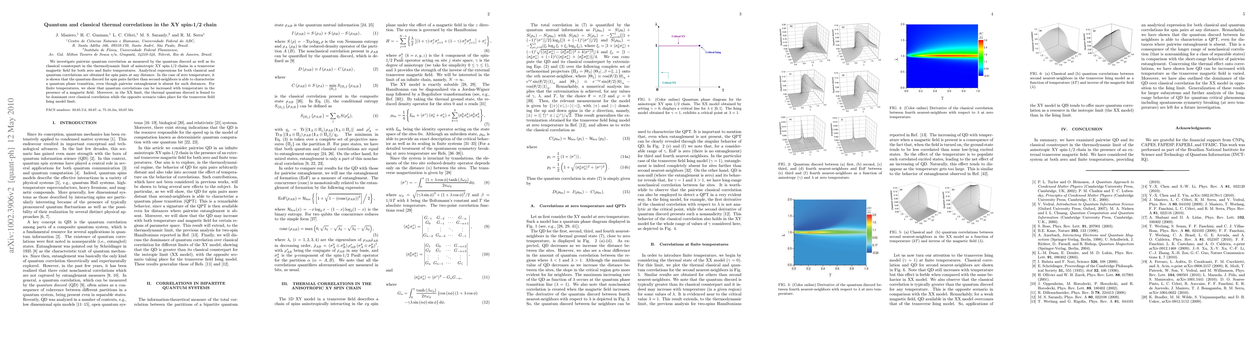 This paper examines quantum and classical thermal correlations in anisotropic XY spin-1/2 chains, finding that quantum discord can characterize quantum phase transitions even where entanglement is absent. At finite temperatures, quantum correlations increase with temperature in a magnetic field, with thermal quantum discord dominating over classical correlation in the XX limit but not in the transverse field Ising model limit.