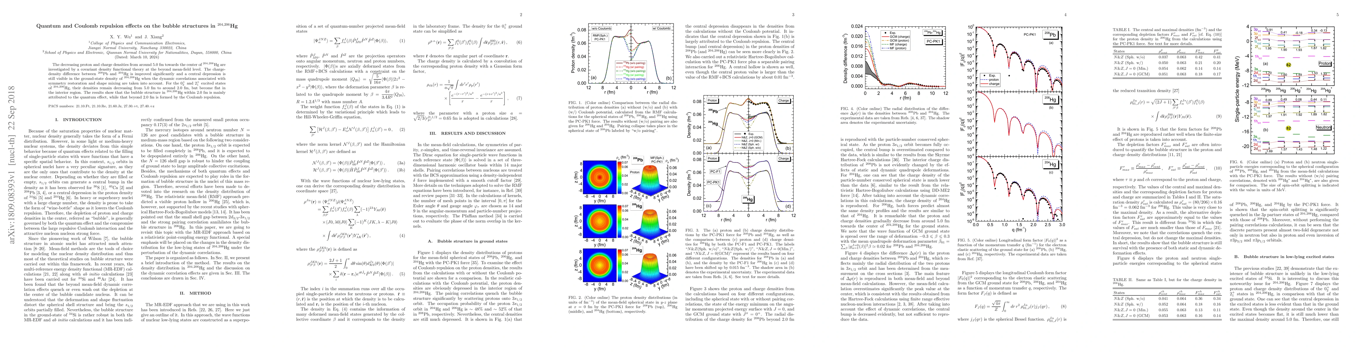 The decreasing proton and charge densities from around 5.0 fm towards the center of $^{204, 206}$Hg are investigated by a covariant density functional theory at the beyond mean-field level.The charge-density difference between $^{208}$Pb and $^{204}$Hg is improved significantly and a central depression is still visible in the ground-state density of $^{204, 206}$Hg when the dynamic correlations associated with symmetry restoration and shape mixing are taken into account. For the $0_2^+$ and $2_1^+$ excited states of $^{204, 206}$Hg, their densities remain decreasing from 5.0 fm to around 2.0 fm, but become flat in the interior region. The results show that the bubble structure in $^{204, 206}$Hg within 2.0 fm is mainly attributed to the quantum effect, while that beyond 2.0 fm is formed by the Coulomb repulsion.