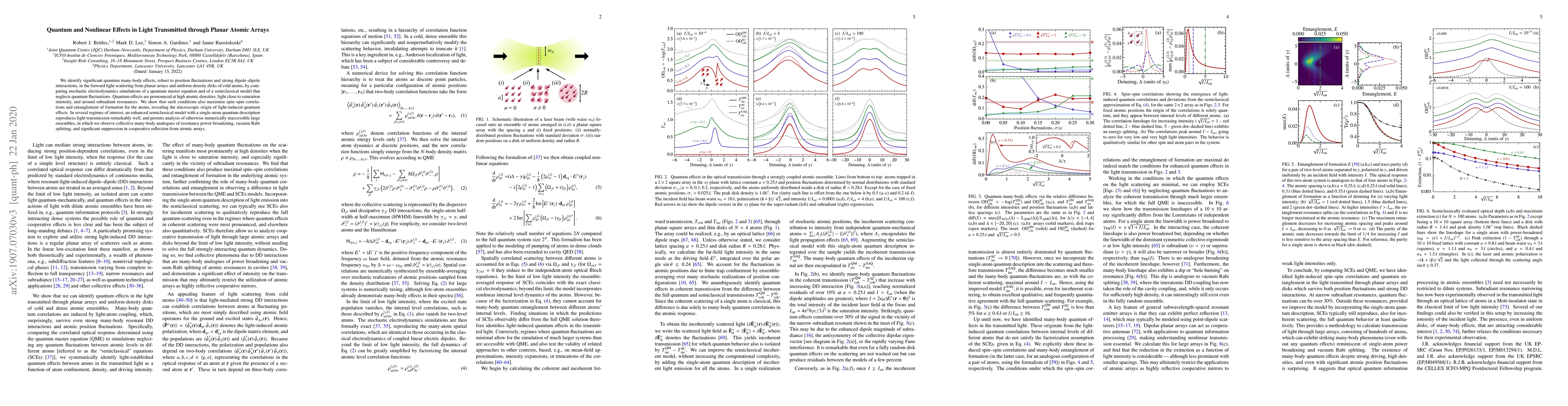 We identify significant quantum many-body effects, robust to position fluctuations and strong dipole--dipole interactions, in the forward light scattering from planar arrays and uniform-density disks of cold atoms, by comparing stochastic electrodynamics simulations of a quantum master equation and of a semiclassical model that neglects quantum fluctuations. Quantum effects are pronounced at high atomic densities, light close to saturation intensity, and around subradiant resonances. We show that such conditions also maximize spin--spin correlations and entanglement of formation for the atoms, revealing the microscopic origin of light-induced quantum effects. In several regimes of interest, an enhanced semiclassical model with a single-atom quantum description reproduces light transmission remarkably well, and permits analysis of otherwise numerically inaccessible large ensembles, in which we observe collective many-body analogues of resonance power broadening, vacuum Rabi splitting, and significant suppression in cooperative reflection from atomic arrays.