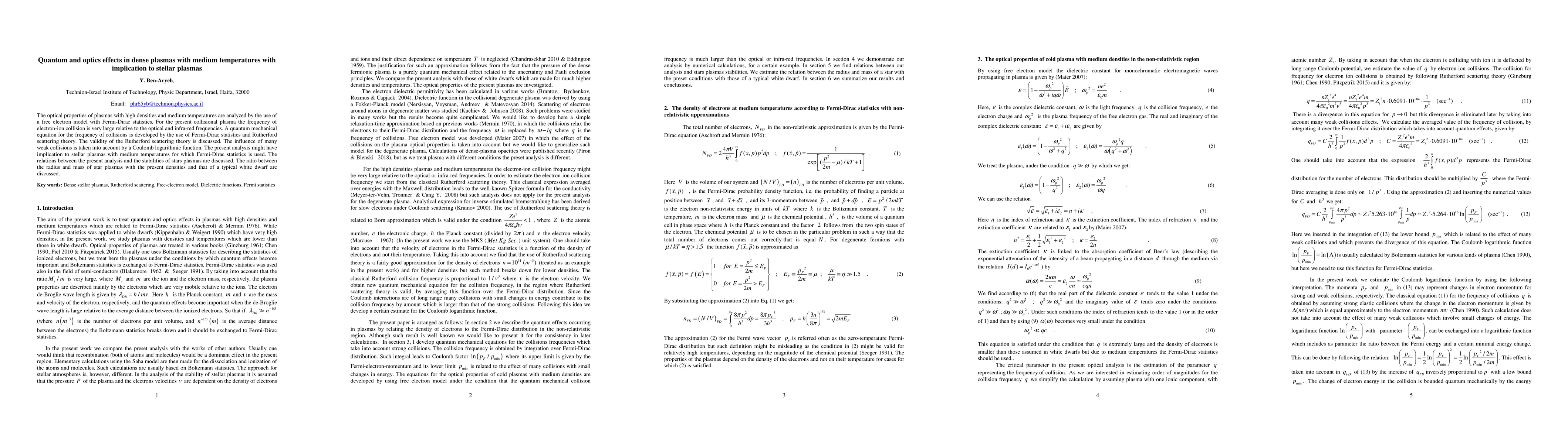 This paper analyzes the optical properties of dense, medium-temperature plasmas using a free electron model and Fermi-Dirac statistics. It develops a quantum mechanical equation for electron-ion collision frequencies, incorporating Rutherford scattering theory and a Coulomb logarithmic function, with implications for stellar plasmas.