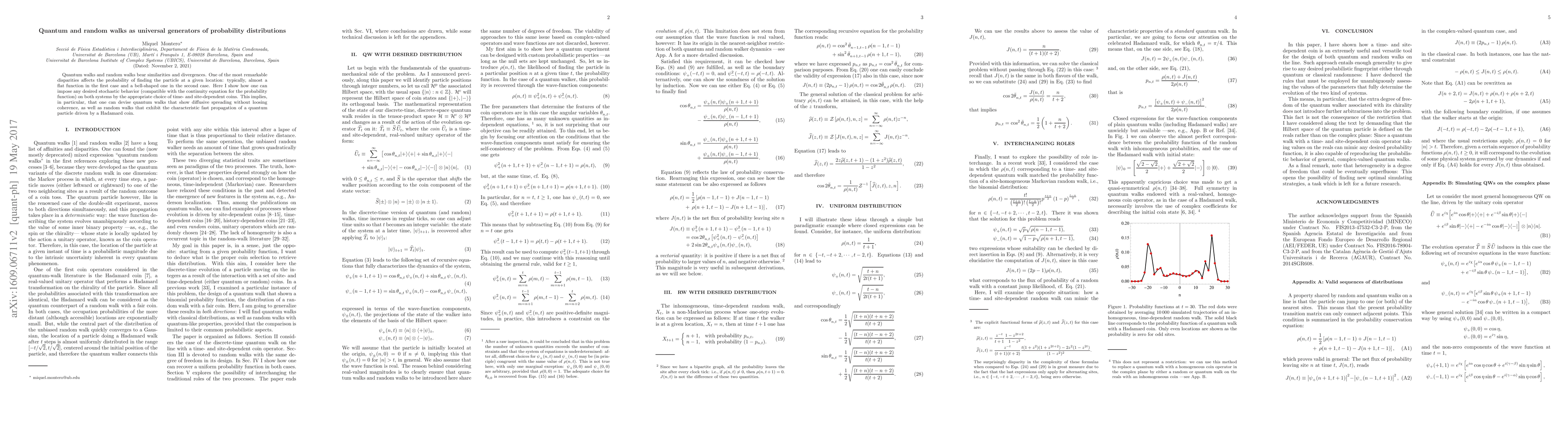 This paper explores how quantum and random walks can be manipulated using time- and site-dependent coins to generate any desired probability distribution, highlighting the potential for quantum walks to exhibit diffusive spreading without losing coherence and random walks to mimic the fast propagation of quantum particles.