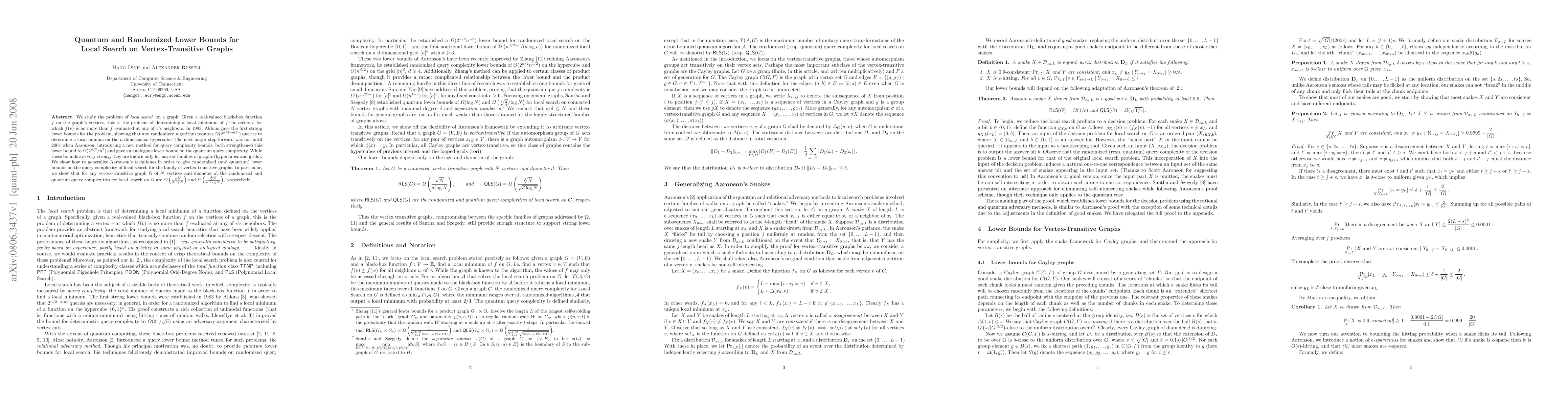 This paper generalizes lower bounds for local search on vertex-transitive graphs, extending Aaronson's techniques to show that randomized algorithms require $\Omega(N^{1/2}/d\log N)$ queries, while quantum algorithms require $\Omega(N^{1/4}/\sqrt{d\log N})$ queries, where $N$ is the number of vertices and $d$ is the diameter.