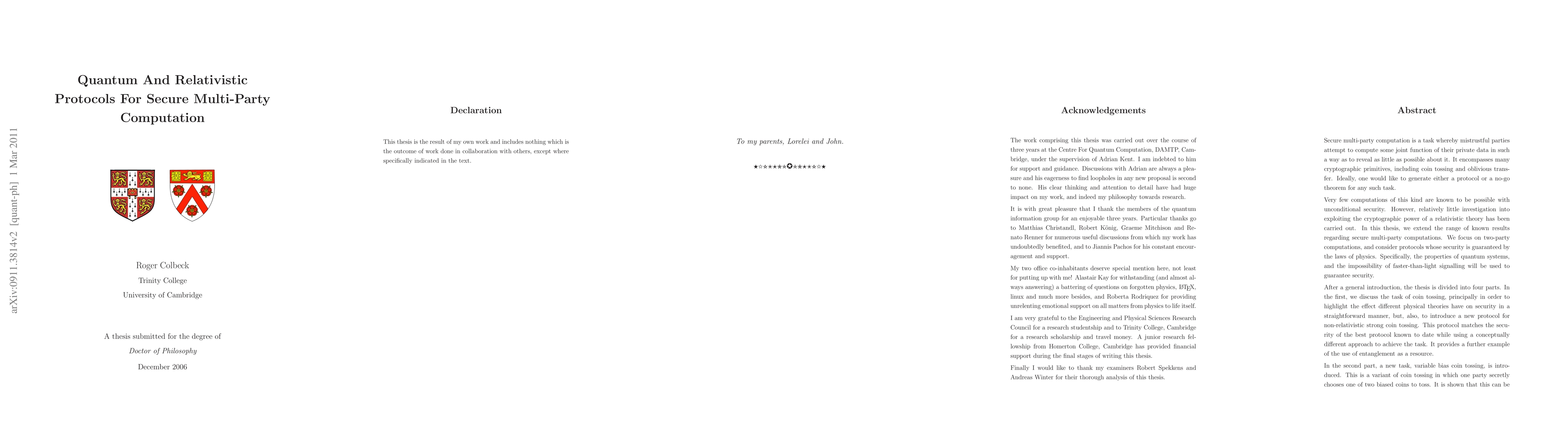 This paper explores secure multi-party computation protocols under quantum and relativistic frameworks, introducing new protocols for coin tossing and variable bias coin tossing with unconditional and cheat-evident security. It also presents a model for two-party secure computations, identifying functions that are impossible to compute securely, and proposes protocols for expanding private random strings even when devices are supplied by a malicious adversary.