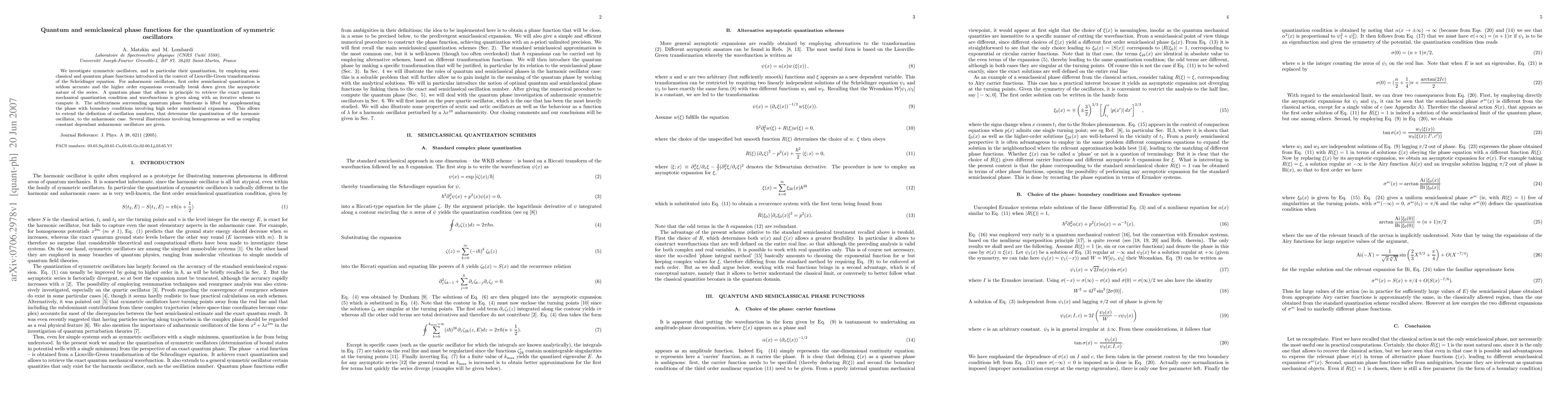 We investigate symmetric oscillators, and in particular their quantization, by employing semiclassical and quantum phase functions introduced in the context of Liouville-Green transformations of the Schr\"{o}dinger equation. For anharmonic oscillators, first order semiclassical quantization is seldom accurate and the higher order expansions eventually break down given the asymptotic nature of the series. A quantum phase that allows in principle to retrieve the exact quantum mechanical quantization condition and wavefunctions is given along with an iterative scheme to compute it. The arbitrariness surrounding quantum phase functions is lifted by supplementing the phase with boundary conditions involving high order semiclassical expansions. This allows to extend the definition of oscillation numbers, that determine the quantization of the harmonic oscillator, to the anharmonic case. Several illustrations involving homogeneous as well as coupling constant dependant anharmonic oscillators are given.