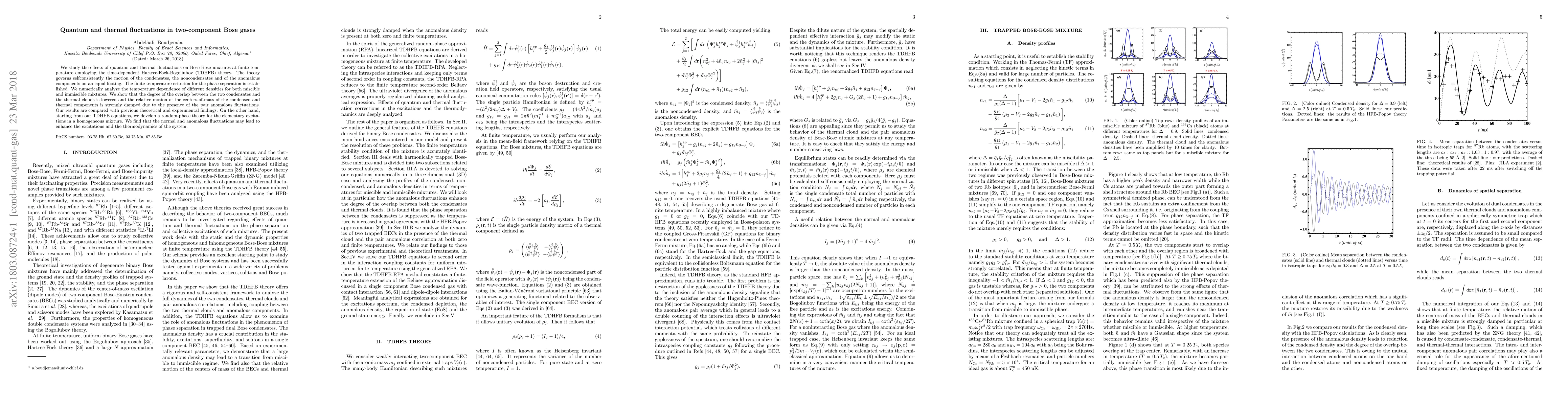 We study the effects of quantum and thermal fluctuations on Bose-Bose mixtures at finite temperature employing the time-dependent Hartree-Fock-Bogoliubov (TDHFB) theory. The theory governs selfconsistently the motion of the condensates, the noncondensates and of the anomalous components on an equal footing. The finite temperature criterion for the phase separation is established. We numerically analyze the temperature dependence of different densities for both miscible and immiscible mixtures. We show that the degree of the overlap between the two condensates and the thermal clouds is lowered and the relative motion of the centers-of-mass of the condensed and thermal components is strongly damped due to the presence of the pair anomalous fluctuations. Our results are compared with previous theoretical and experimental findings. On the other hand, starting from our TDHFB equations, we develop a random-phase theory for the elementary excitations in a homogeneous mixture. We find that the normal and anomalous fluctuations may lead to enhance the excitations and the thermodynamics of the system.