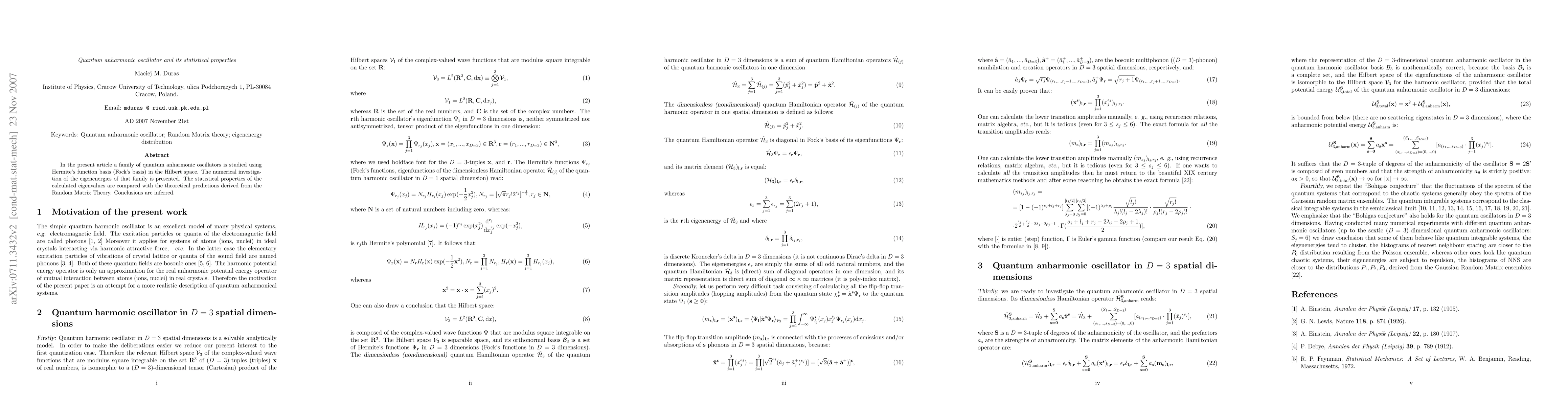 This paper investigates quantum anharmonic oscillators using Hermite's function basis and numerically examines their eigenenergies. The statistical properties of these eigenvalues are analyzed and compared with predictions from Random Matrix Theory, leading to significant conclusions.