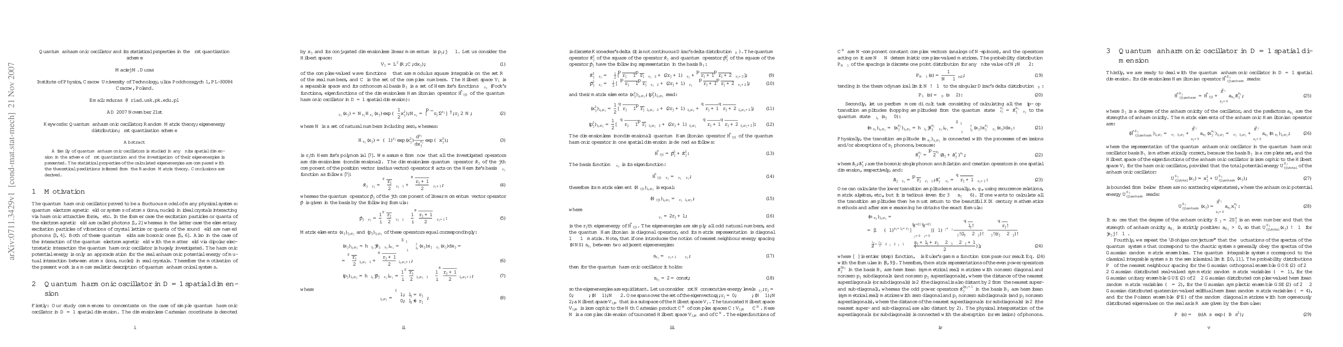 This paper investigates quantum anharmonic oscillators in various dimensions using first quantization, analyzing their eigenenergies and comparing the statistical properties with predictions from Random Matrix theory. Conclusions are drawn regarding the alignment of calculated eigenenergies with theoretical models.