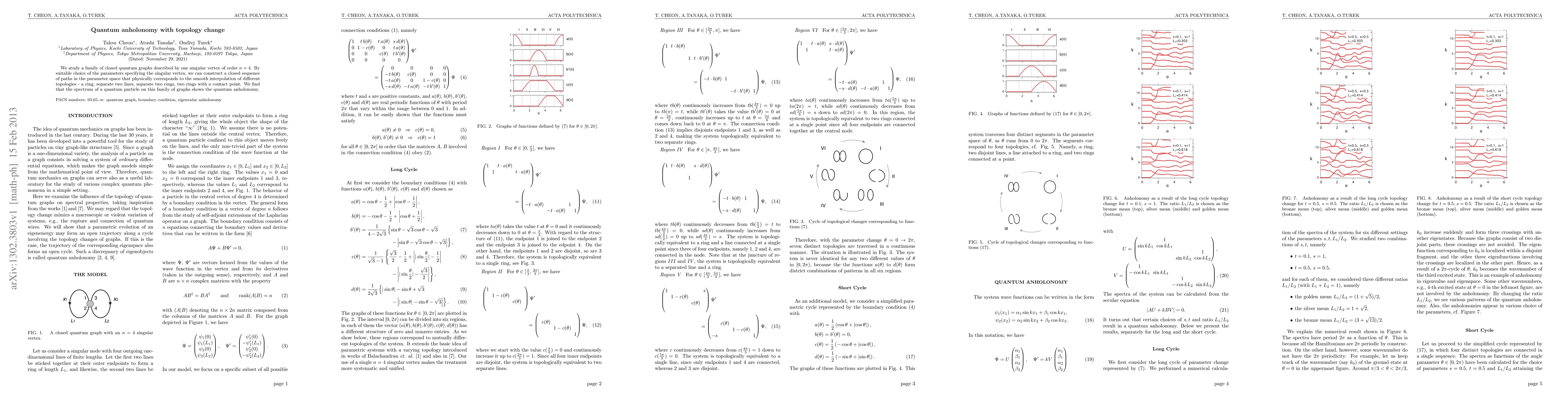We study a family of closed quantum graphs described by one singular vertex of order n=4. By suitable choice of the parameters specifying the singular vertex, we can construct a closed sequence of paths in the parameter space that physically corresponds to the smooth interpolation of different topologies - a ring, separate two lines, separate two rings, two rings with a contact point. We find that the spectrum of a quantum particle on this family of graphs shows the quantum anholonomy.