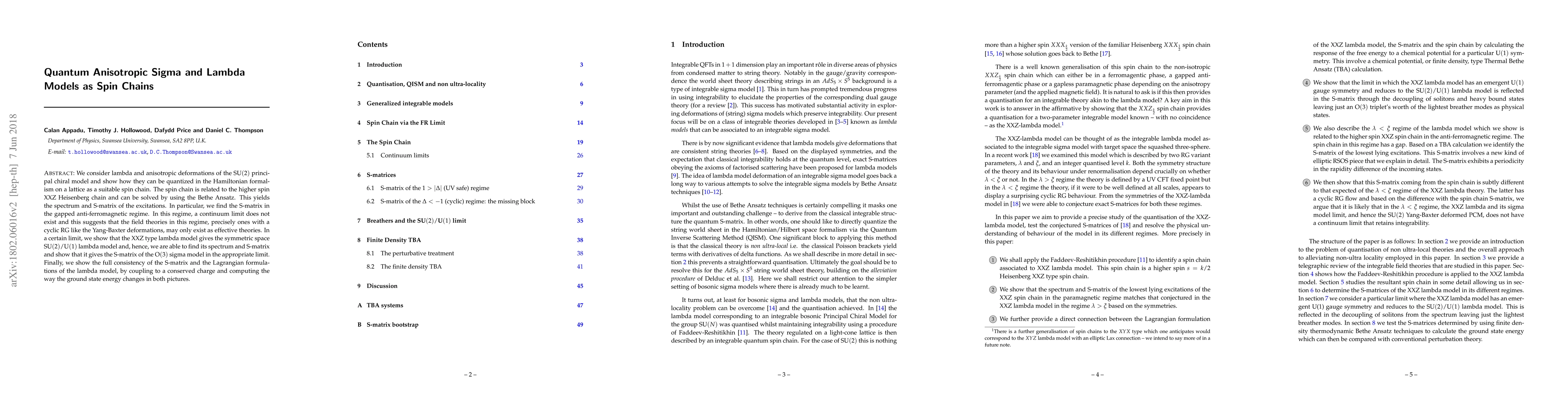 We consider lambda and anisotropic deformations of the SU(2) principal chiral model and show how they can be quantized in the Hamiltonian formalism on a lattice as a suitable spin chain. The spin chain is related to the higher spin XXZ Heisenberg chain and can be solved by using the Bethe Ansatz. This yields the spectrum and S-matrix of the excitations. In particular, we find the S-matrix in the gapped anti-ferromagnetic regime. In this regime, a continuum limit does not exist and this suggests that the field theories in this regime, precisely ones with a cyclic RG like the Yang-Baxter deformations, may only exist as effective theories. In a certain limit, we show that the XXZ type lambda model gives the symmetric space SU(2)/U(1) lambda model and, hence, we are able to find its spectrum and S-matrix and show that it gives the S-matrix of the O(3) sigma model in the appropriate limit. Finally, we show the full consistency of the S-matrix and the Lagrangian formulations of the lambda model, by coupling to a conserved charge and computing the way the ground state energy changes in both pictures.