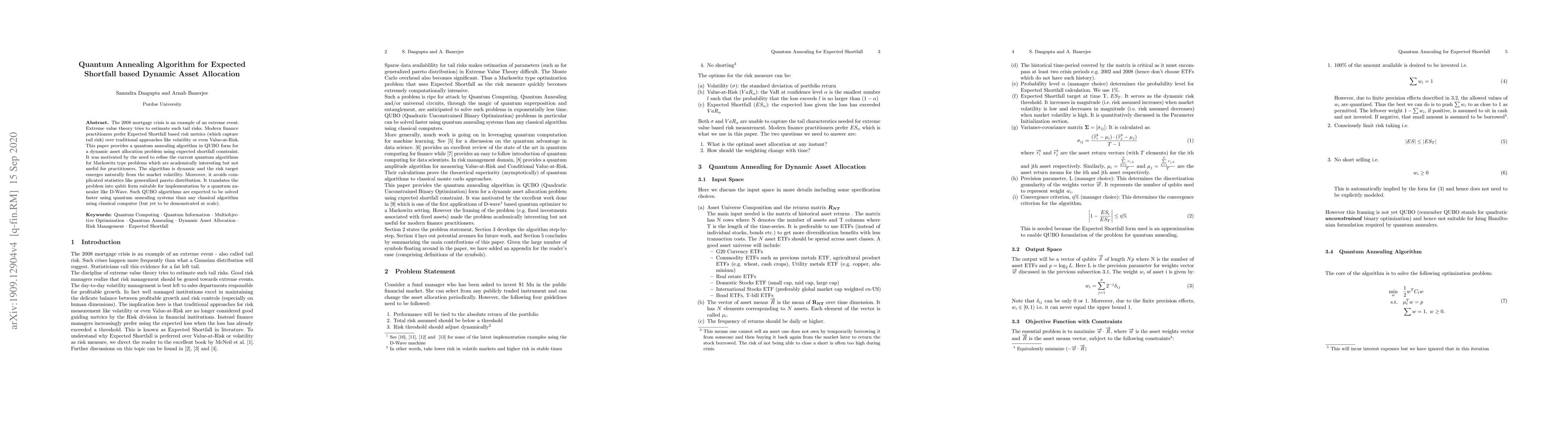 The 2008 mortgage crisis is an example of an extreme event. Extreme value theory tries to estimate such tail risks. Modern finance practitioners prefer Expected Shortfall based risk metrics (which capture tail risk) over traditional approaches like volatility or even Value-at-Risk. This paper provides a quantum annealing algorithm in QUBO form for a dynamic asset allocation problem using expected shortfall constraint. It was motivated by the need to refine the current quantum algorithms for Markowitz type problems which are academically interesting but not useful for practitioners. The algorithm is dynamic and the risk target emerges naturally from the market volatility. Moreover, it avoids complicated statistics like generalized pareto distribution. It translates the problem into qubit form suitable for implementation by a quantum annealer like D-Wave. Such QUBO algorithms are expected to be solved faster using quantum annealing systems than any classical algorithm using classical computer (but yet to be demonstrated at scale).