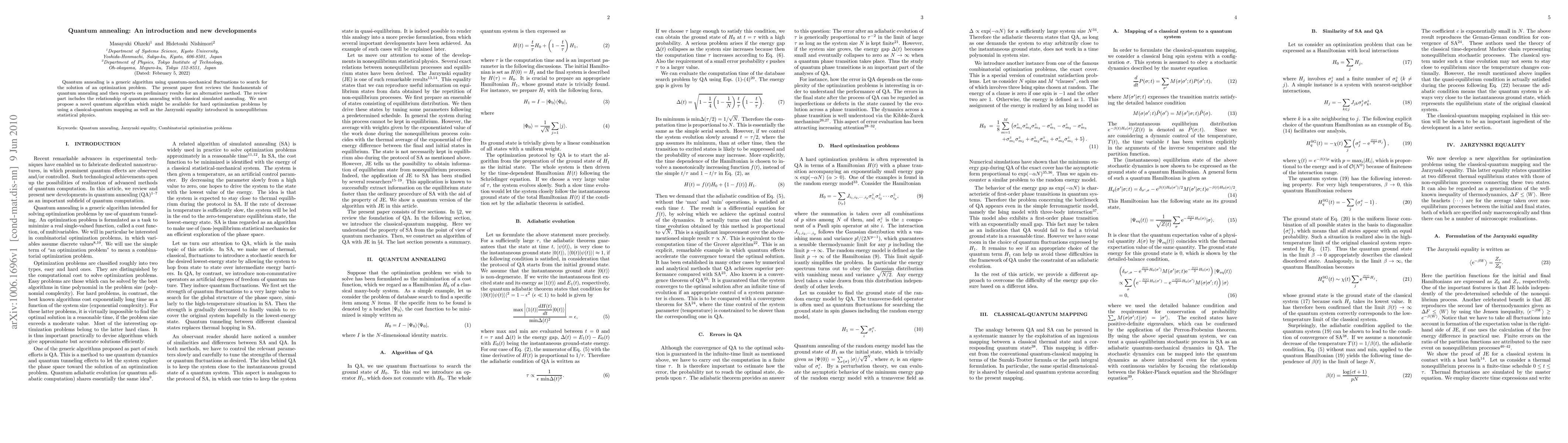This paper reviews the fundamentals of quantum annealing and its relationship with classical simulated annealing, and introduces a novel quantum algorithm for hard optimization problems using a classical-quantum mapping and the Jarzynski equality from nonequilibrium statistical physics. Preliminary results are reported for this new method.