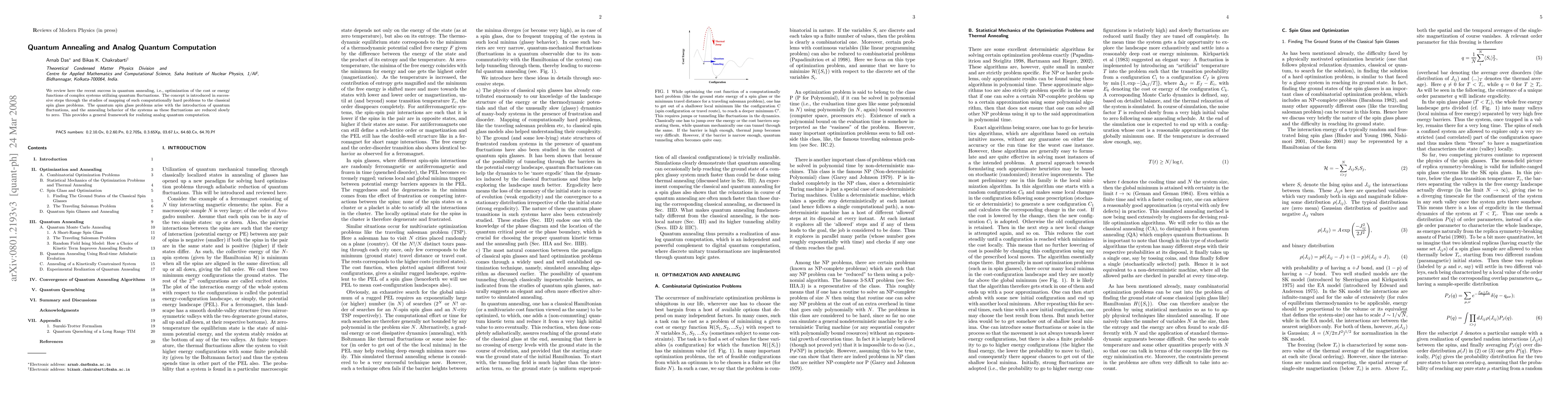 This paper reviews advancements in quantum annealing, focusing on optimizing complex systems' cost functions using quantum fluctuations. It explores mapping computationally hard problems to classical spin glass models and introduces quantum spin glass problems, illustrating the annealing behavior and providing a framework for analog quantum computation.