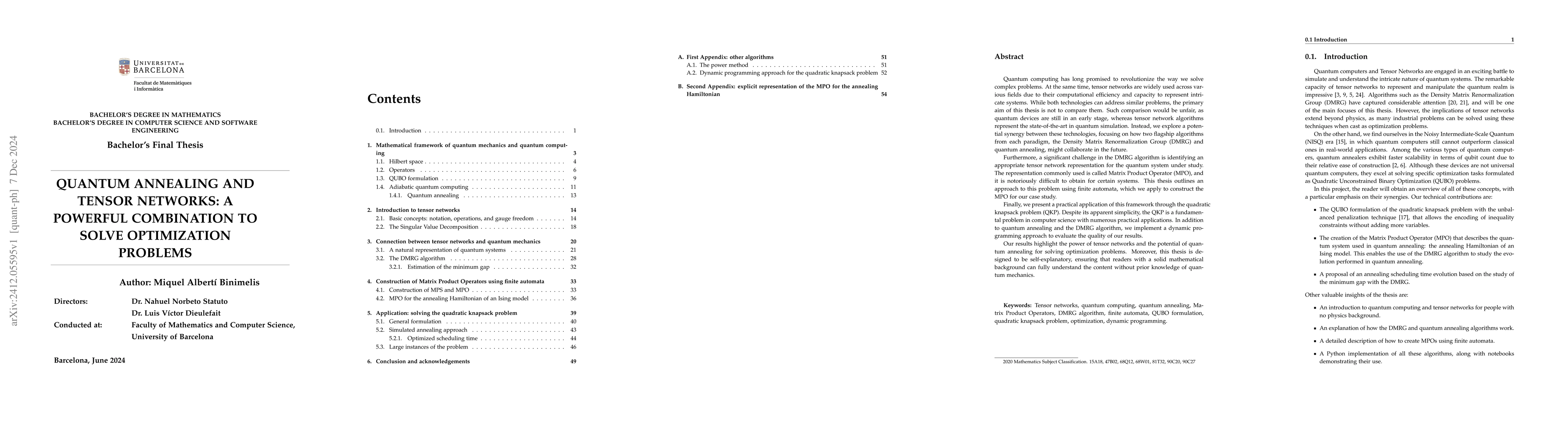 This thesis investigates the synergistic potential of combining quantum annealing and tensor networks to tackle optimization problems, focusing on the Density Matrix Renormalization Group (DMRG) and quantum annealing algorithms. It proposes a novel method using finite automata to construct the Matrix Product Operator (MPO) for DMRG, and applies this to solve the quadratic knapsack problem, demonstrating the effectiveness of this approach alongside quantum annealing and dynamic programming.